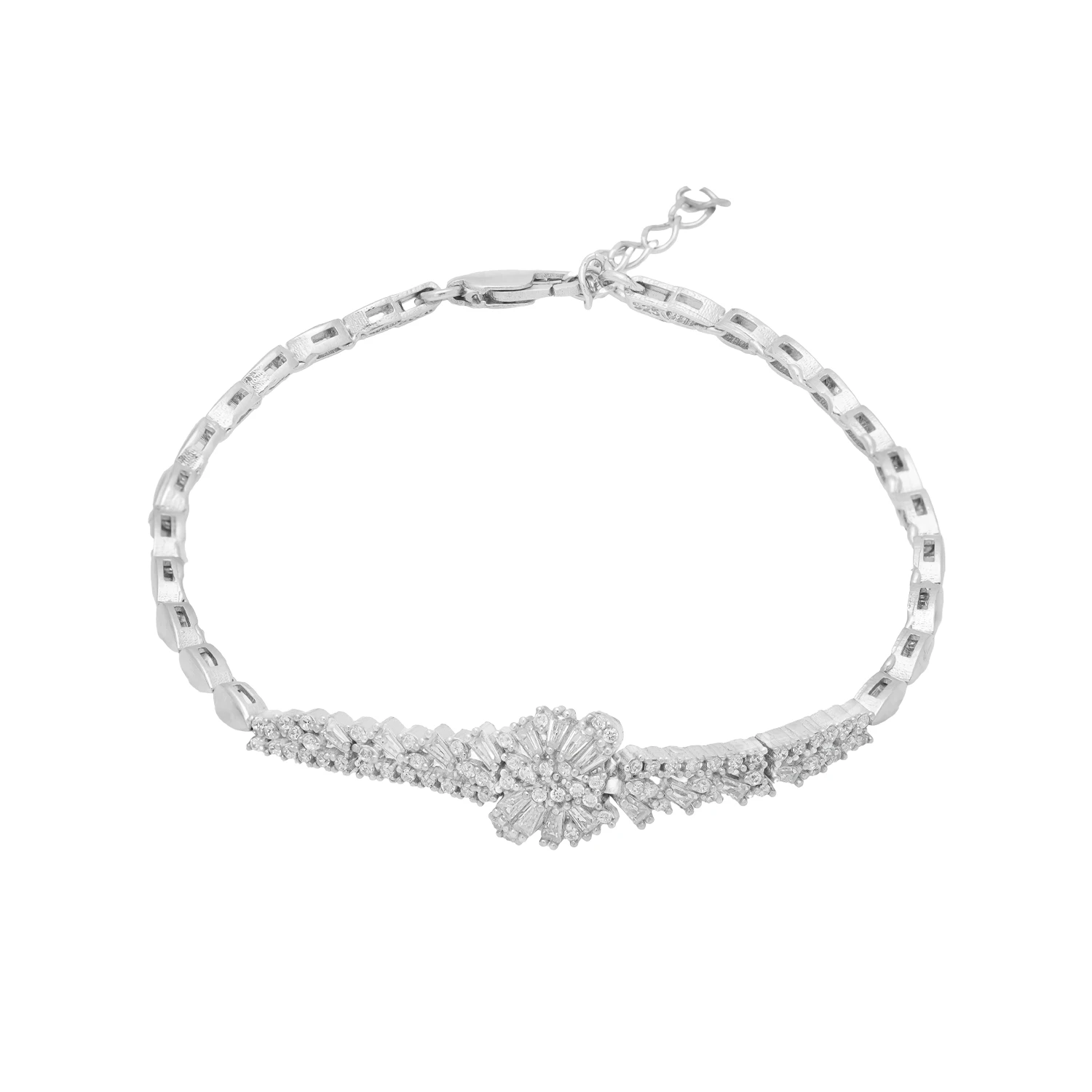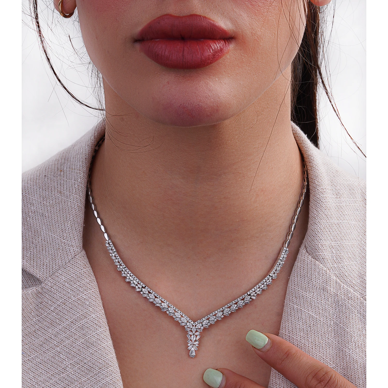 این سرویس نقره با طراحی ظریف و یکپارچه، جلوهای از هنر و شکوه را به نمایش میگذارد. ترکیب نگینهای زیرکونیا در برشهای گوناگون—از مارکیزهای کشیده گرفته تا باگتهای نورگیر و نگینهای گرد ریز—ساختاری پیچیده و چشمگیر ایجاد کرده که در تمامی اجزا، از گردنبند تا گوشواره و دستبند، تکرار شده است.