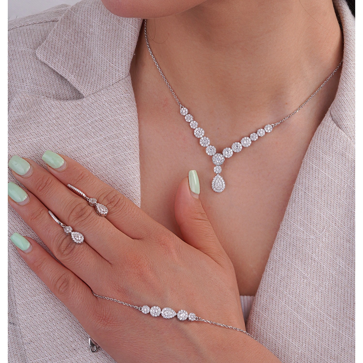 سرویس نقرهای شامل یک جفت گوشواره، یک دستبند و یک گردنبند با نگینهای زیرکونیا، طراحی لوکس و مناسب برای مجالس رسمی و هدیههای خاص