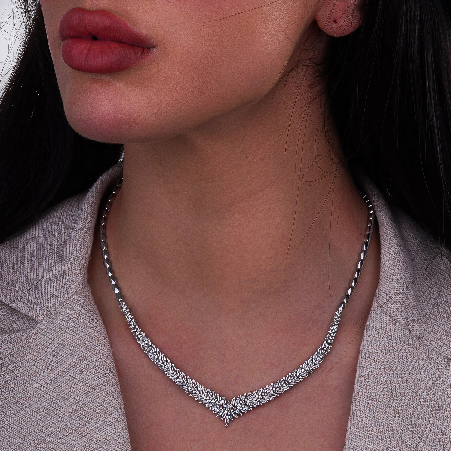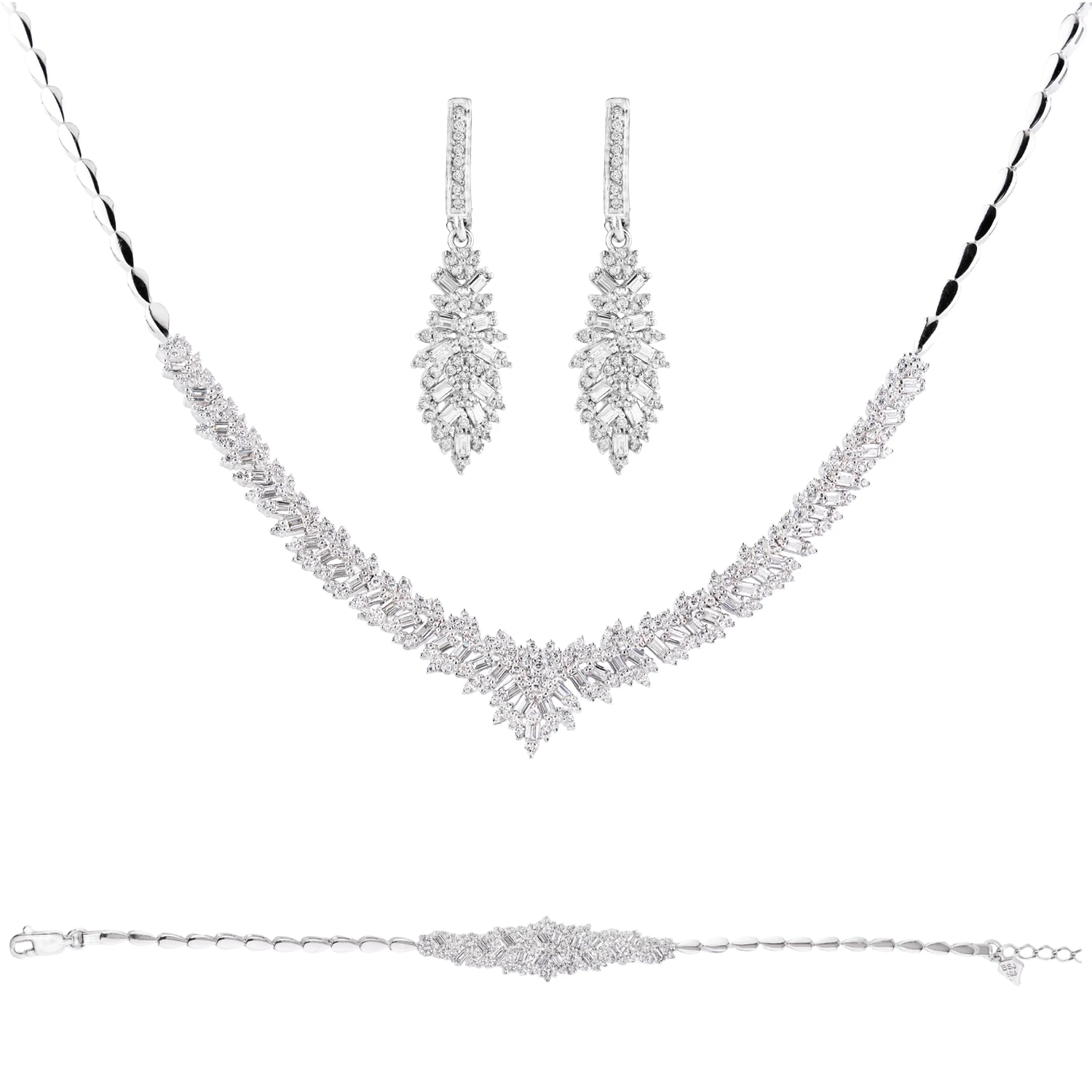 فرم V گردنبند باعث میشود روی خط گردن کاملاً بدرخشد و چیدمان چندلایهی نگینها جلوهای لاکچری ایجاد کند. گوشوارهها نیز با طراحی کشیده و تراشهای چندبعدی، در صورت انعکاس نور، بیشترین درخشش را ارائه میدهند.