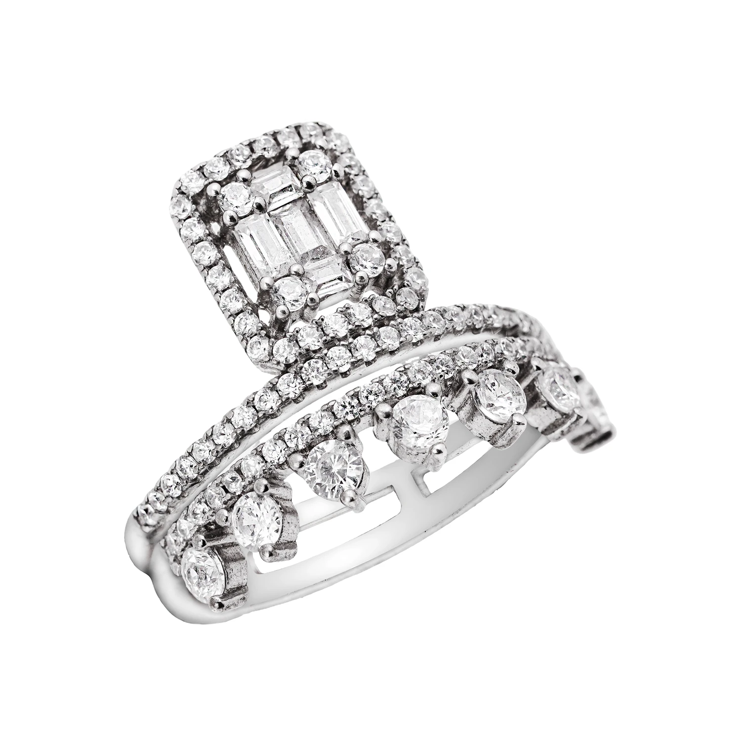 انگشتر نقره زنانه با طراحی زیبا و سنگهای زیرکونیا سفید. مناسب مجالس رسمی و هدیههای ویژه. خرید آنلاین از شمیم سیلور.