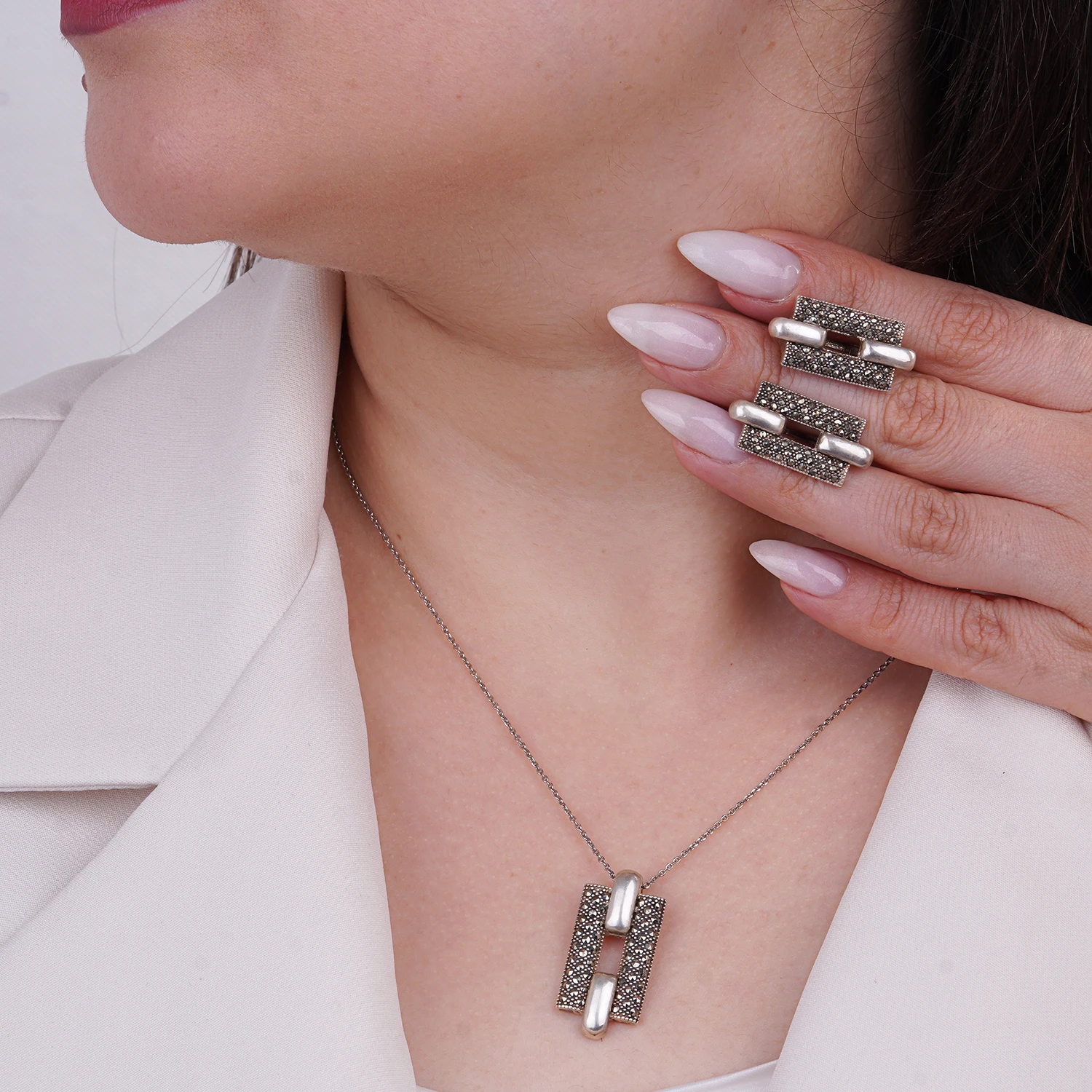 ترکیب رنگ نقره تیره با درخشش ملایم نگینهای مارکازیت، جلوهای کلاسیک، سنگین و اصیل ایجاد کرده است.