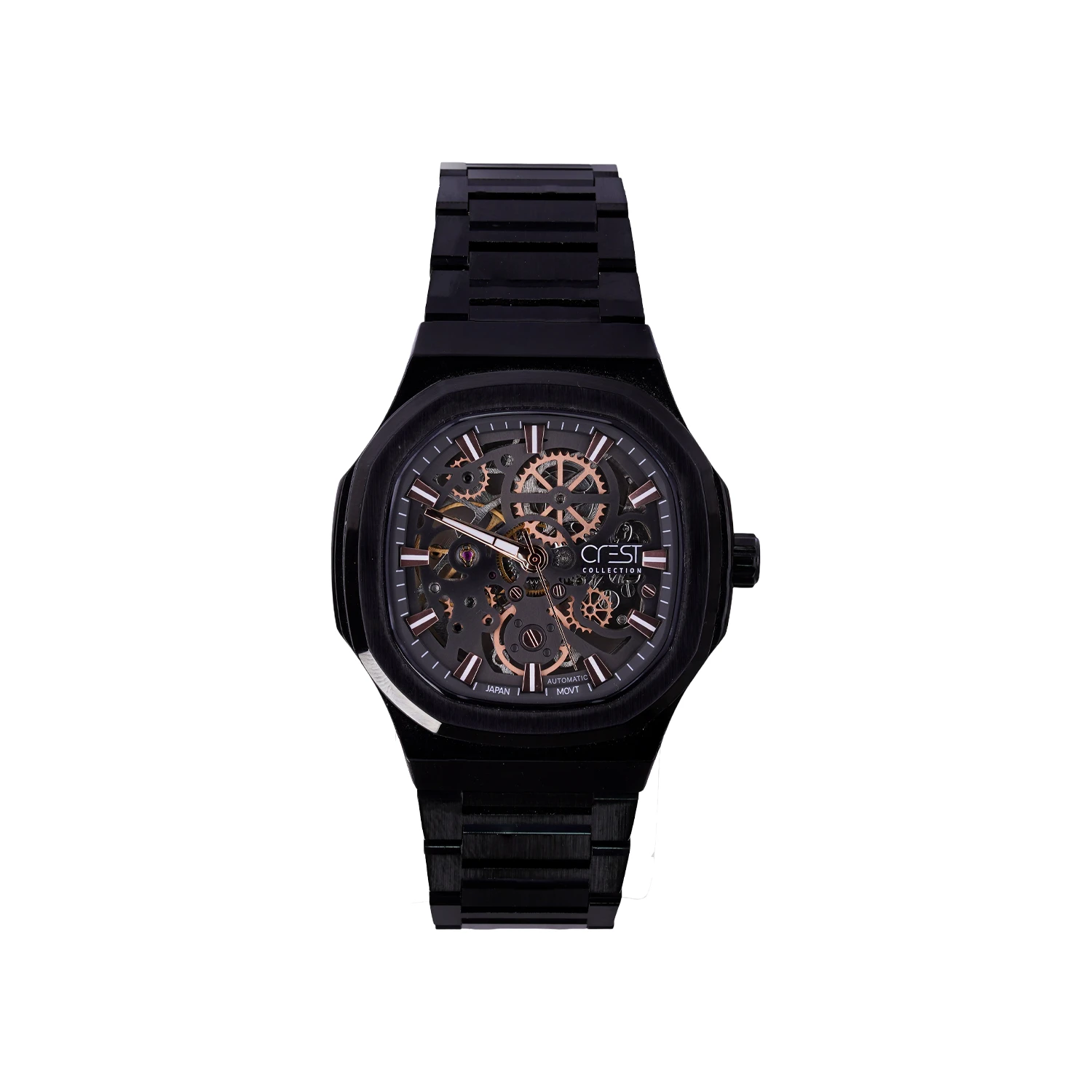 رنگ مشکی مات بدنه همراه با طراحی اسکلتون، در کنار خطوط و اجزای مسی، جلوهای شیک و متمایز ایجاد کرده است. این ساعت درخشش خاصی دارد که توجه هر بینندهای را جلب میکند و مناسب افرادی است که به دنبال استایلی منحصر به فرد هستند.