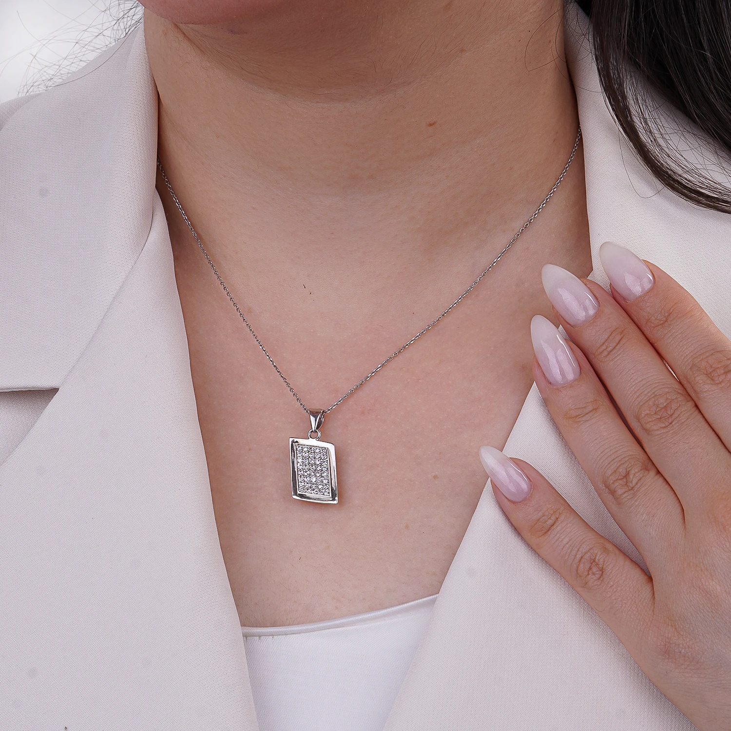 رنگ نقرهای براق با پرداخت آینهای، بهزیبایی با نگینهای شفاف هماهنگ شده و جلوهای درخشان، تمیز و مدرن ایجاد کرده است. این ترکیب باعث میشود نیمست بهراحتی با دیگر زیورآلات نقره یا استایلهای رسمی ست شود.