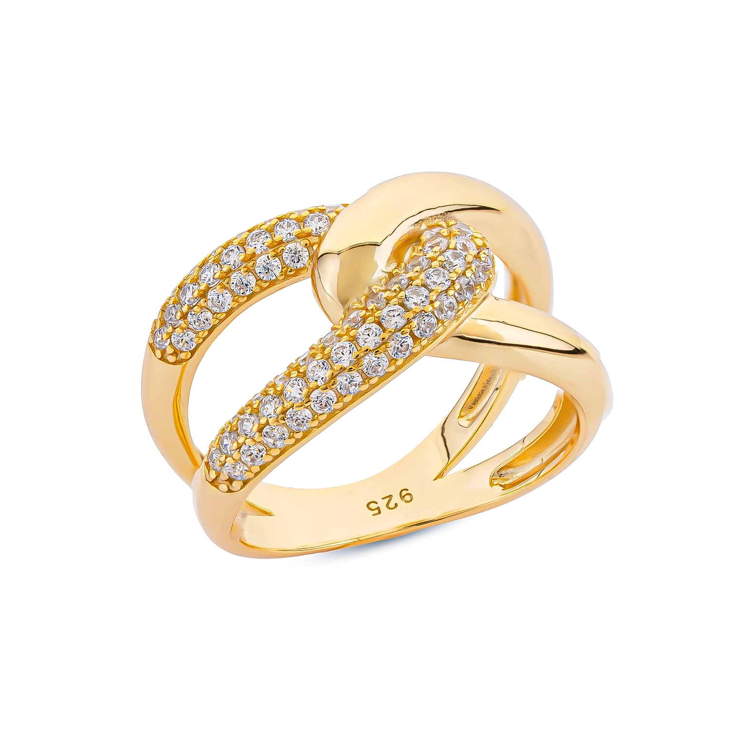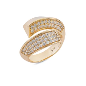 انگشتر نقره زنانه طلایی با طراحی کراس و نگینهای زیرکنیا سفید، ساختهشده از نقره 925، مناسب استایل مدرن و هدیهای شیک و خاص.