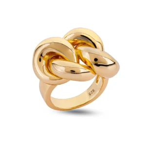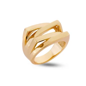 این انگشتر زنانه طلایی با طراحی کراس و خطوط منحنی درهمتنیده، جلوهای مدرن و متفاوت روی دست ایجاد میکند. ترکیب سطوح کاملاً صیقلی با دو ردیف نگین زیرکنیا سفید، تعادل زیبایی بین سادگی و درخشش را به نمایش میگذارد.