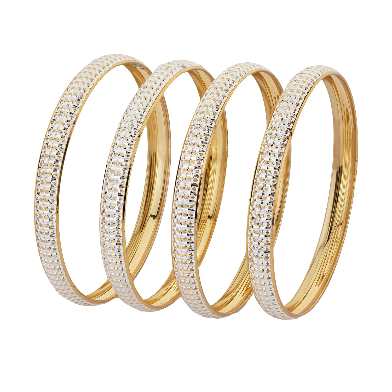 این النگو زنانه نقره با آبکاری طلایی، طراحی ظریف و بافت برجسته منظم دارد که جلوهای لوکس و درخشان ایجاد میکند؛ بدون استفاده از نگین، اما با تکنیک پرداخت خاص که نور را به زیبایی بازتاب میدهد.