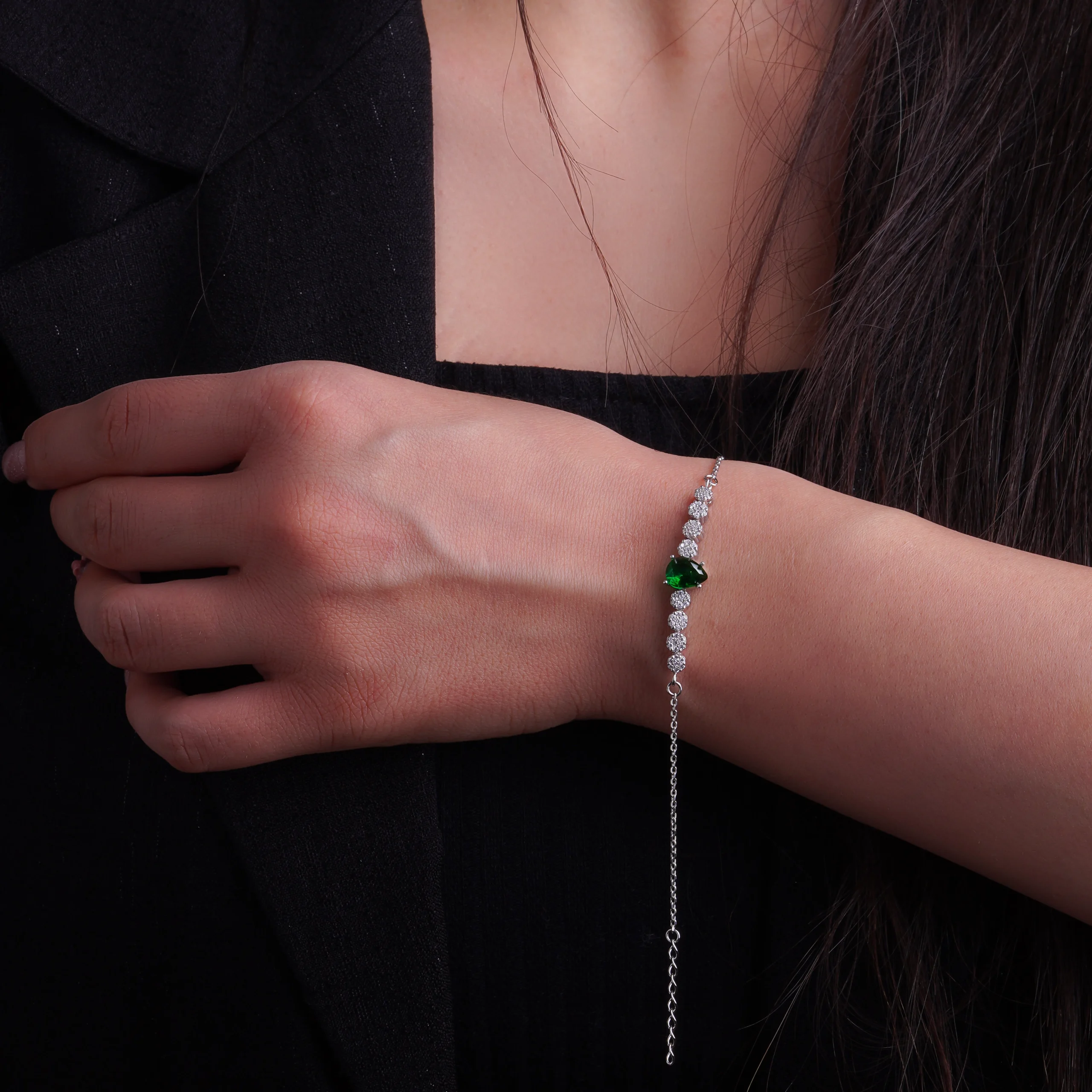 دستبند نقرهای با طراحی شیک و زیبا، سنگ کریستال سبز و زیرکونیا، مناسب برای استفاده روزمره و هدیههای خاص.