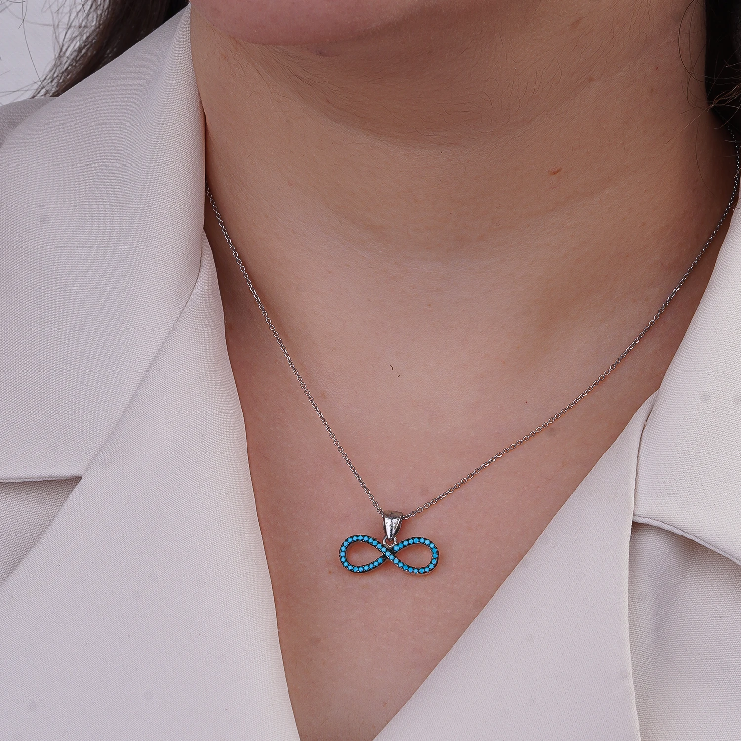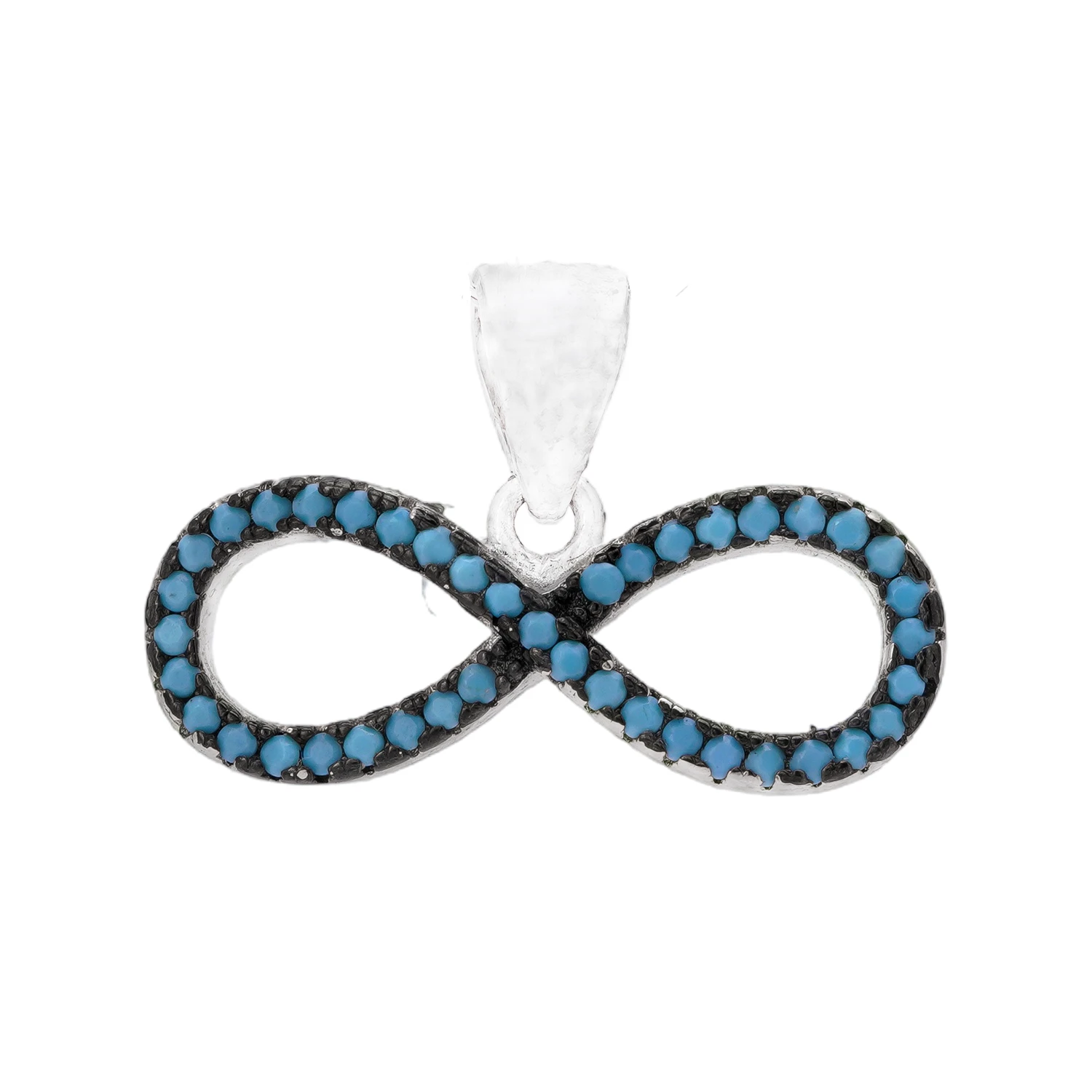 نیمست نقره طرح بینهایت با نگینهای فیروزهای، مناسب هدیه و استفاده روزمره. طراحی ظریف و سبک از شمیم سیلور – کد 10150039.