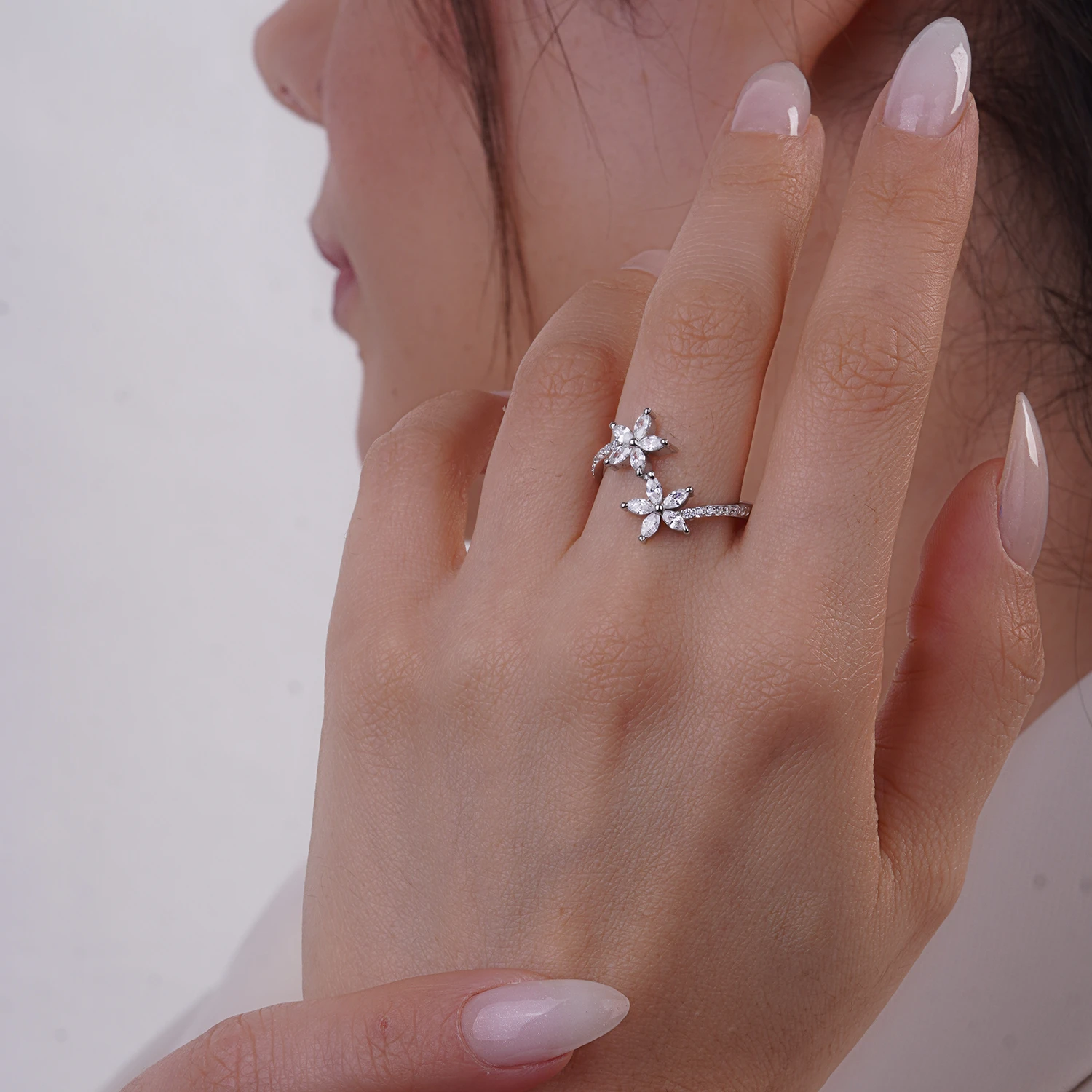 انگشتر نقره زنانه با طراحی گلهای مارکیز درخشان و نگینهای ظریف. مناسب هدیه و استایل روزمره شیک. خرید از شمیم سیلور.