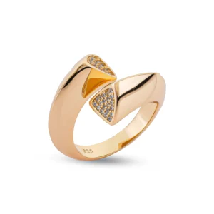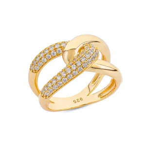 چیدمان میکروست نگینها در دو ردیف موازی، باعث انعکاس نور بیشتر و جلوهای لوکس میشود، در حالی که بخشهای طلایی صیقلی، طراحی را مدرن و مینیمال نگه داشتهاند. فرم پهن رکاب، این مدل را به انتخابی چشمگیر برای استایلهای خاص تبدیل کرده است.