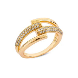 این انگشتر زنانه طلایی با طراحی مدرن و ساختار چندلایه، جلوهای خاص و متفاوت روی دست ایجاد میکند. ترکیب خطوط صاف و براق با ردیفهای درخشان نگینهای زیرکنیا سفید، تعادلی زیبا بین سادگی و درخشش به وجود آورده است.