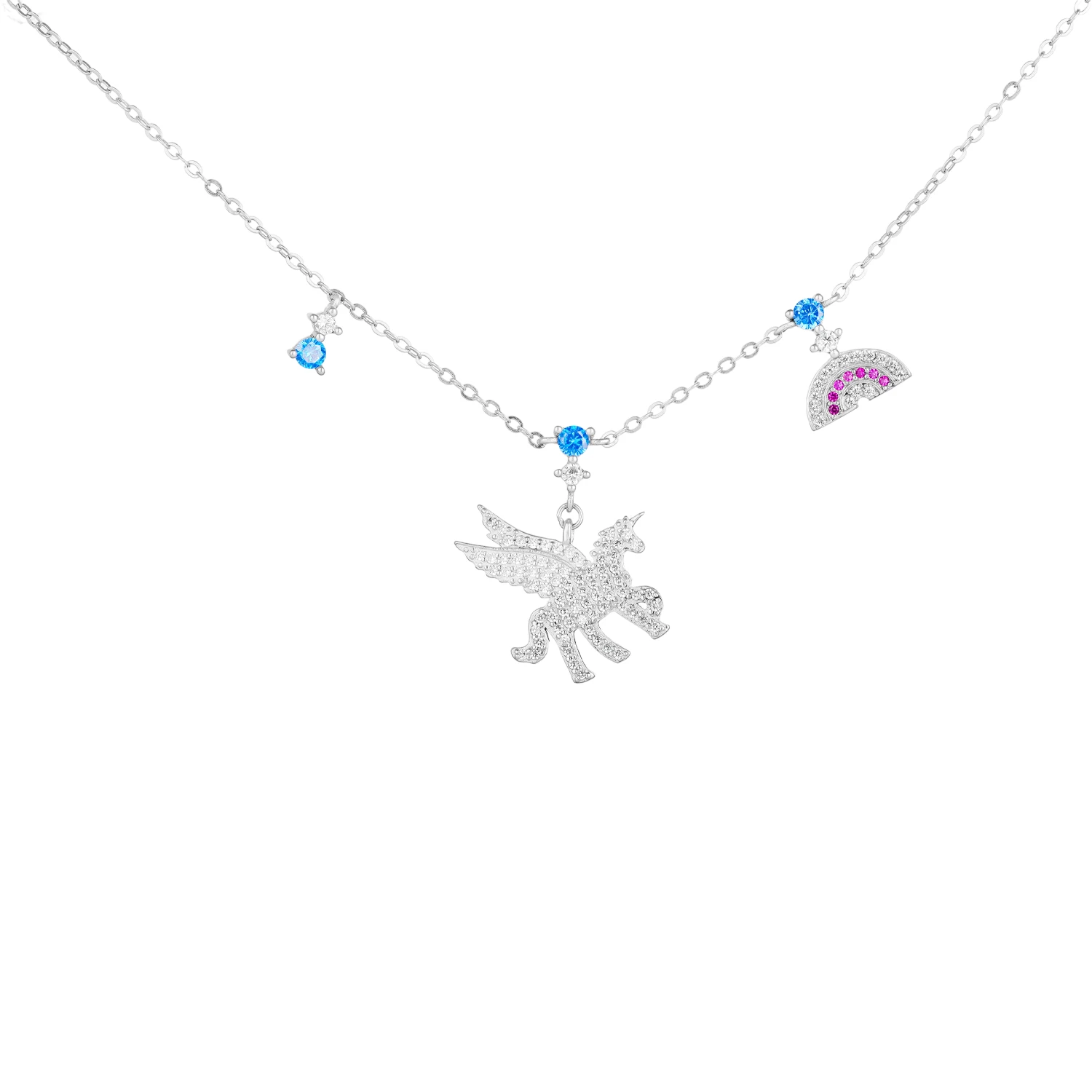 این گردنبند نقره با طراحی فانتزی و روایی، الهامگرفته از اسب بالدار (پگاسوس)، نمادی از آزادی، قدرت درونی و خیالپردازی است. آویز مرکزی با نگینهای سفید زیرکونیا بهصورت میکروست پوشیده شده و درخشش یکنواخت و ظریفی ایجاد میکند که در نور، جلوهای زنده و چشمنواز دارد.