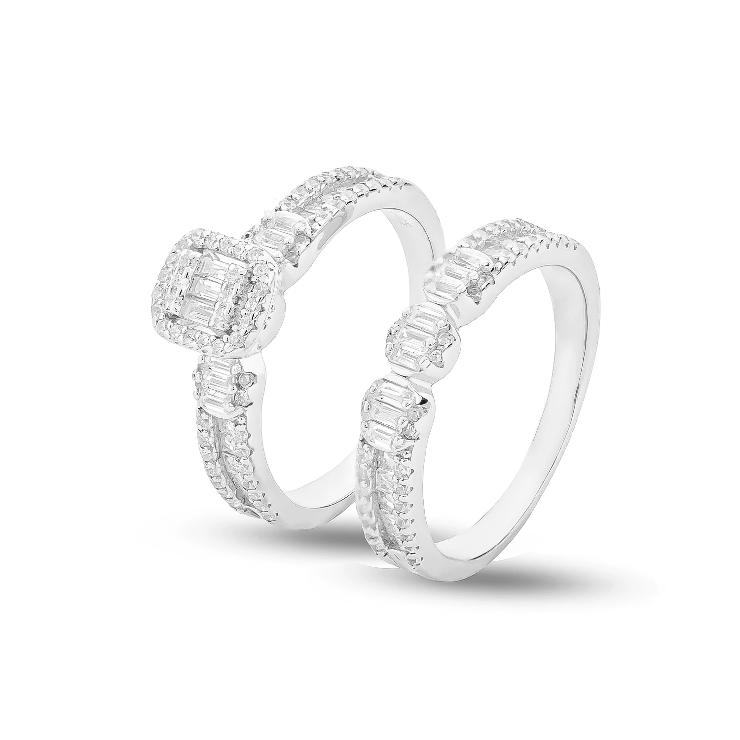 ست انگشتر و پشت انگشتر نقره زنانه با نگینهای زیرکنیا سفید و برش باگت، ساخته شده از نقره 925، انتخابی لوکس برای هدیه و مجالس.