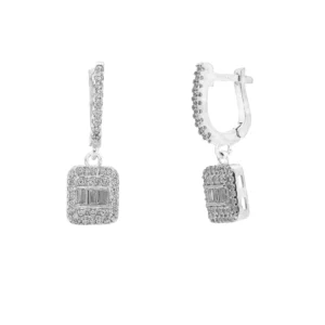 گوشواره نقره زنانه کد 100150070 تجسم ظرافت و درخشش در قالبی مجلسی و لوکس است. در بخش بالایی گوشواره، گل کوچک و ظریفی از نگینهای ریز زیرکونیا نشسته که مانند شکوفهای نورگیر، نگاه را به سمت خود میکشد. زیر این گل، آویزی مستطیلشکل قرار دارد که مرکز آن با نگینهای باگت تراشخورده پر شده و دور تا دورش با ردیفی از نگینهای میکروست احاطه شده است؛ ترکیبی که جلوهای جواهرگونه و بسیار چشمگیر ایجاد میکند.