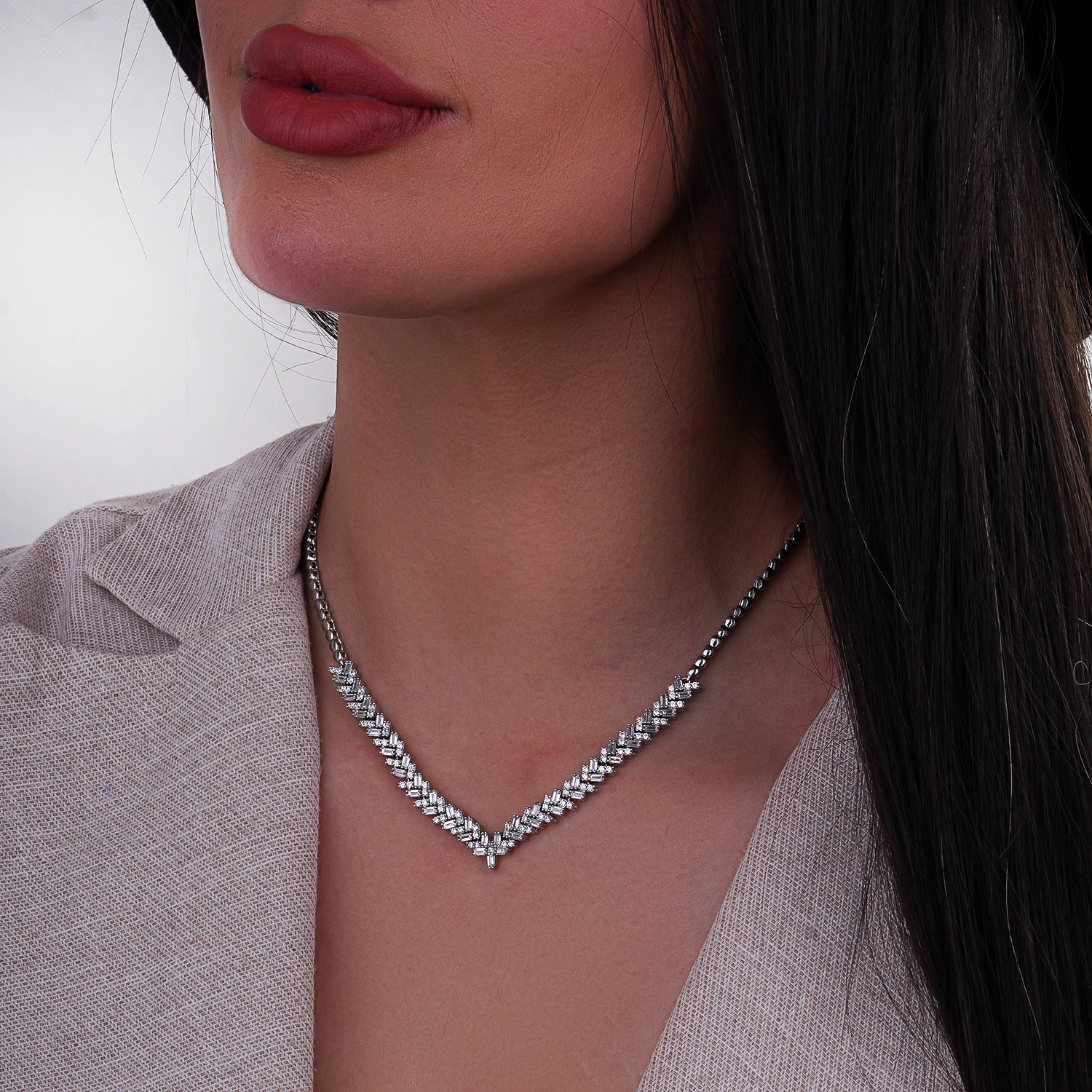 گردنبند نقره ۹۲۵ با طراحی باگت و نگینکاری میکروست؛ انتخابی لوکس و درخشان برای استایل مجلسی و هدیههای خاص. خرید باکیفیت از شميم سيلور.