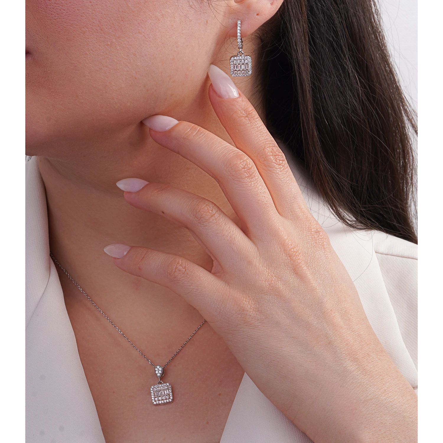 گوشوارههای آویز با قفل اهرمی و نگینهای ریز، زیبایی و هماهنگی طراحی را تکمیل میکنند و پلاک نیز با حرکت ملایم خود نور را به شکلی دلنشین منعکس میکند. این نیمست انتخابی مناسب برای بانوانی است که به طراحیهای مدرن، شیک و فاخر علاقه دارند.