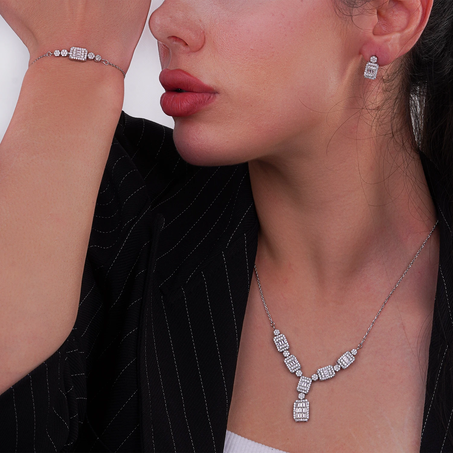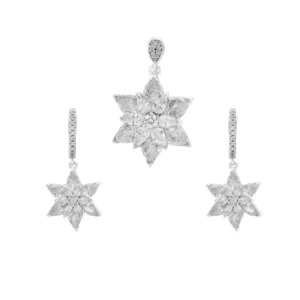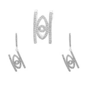 این ست نقره ۹۲۵ با طراحی جواهرات کلاسیک و درخشان، ترکیب فوقالعادهای از نگینهای باگت و میکروست را ارائه میدهد. در گردنی، پلاکهای مربعی با نگینهای تراش باگت و میکروست به صورت متناوب و هماهنگ قرار گرفتهاند که جلوهای شفاف، پرنور و مجلل ایجاد میکند. طراحی آویزها و پلاکهای متصل به هم، ترکیب زیبایی از درخشش و سبک کلاسیک را در خود دارد.