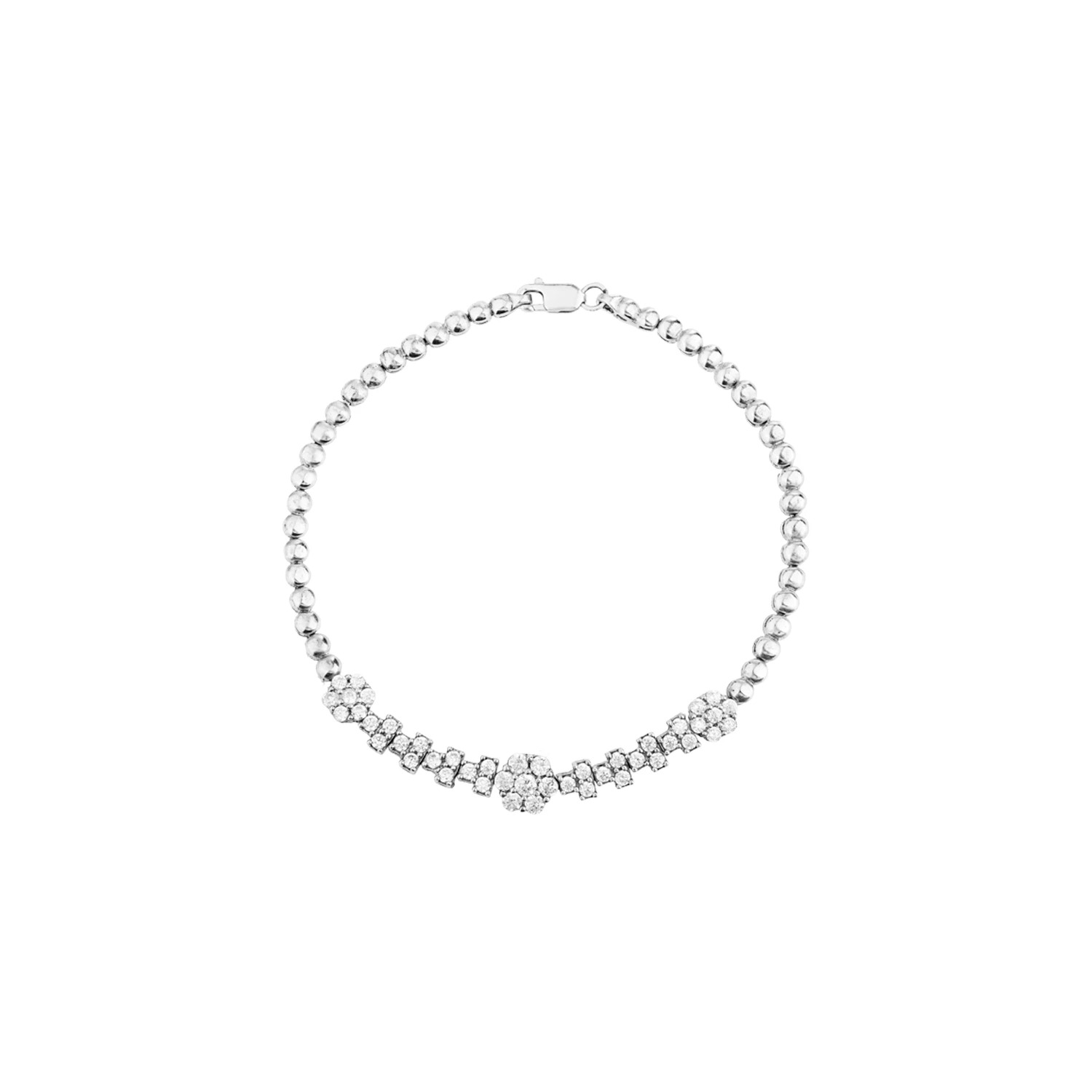 مهرههای صیقلی نقره، بهصورت منظم کنار هم چیده شدهاند و در بخش مرکزی، خوشهای از نگینهای زیرکونیا با تراشهای دقیق، جلوهای چشمگیر و درخشان ایجاد میکنند. این تناسب میان سادگی مهرهها و شکوه قسمت نگینکاریشده، باعث شده دستبند برای هر استایلی—from مینیمال روزانه تا مهمانیهای رسمی—یک انتخاب خاص و لوکس باشد.
