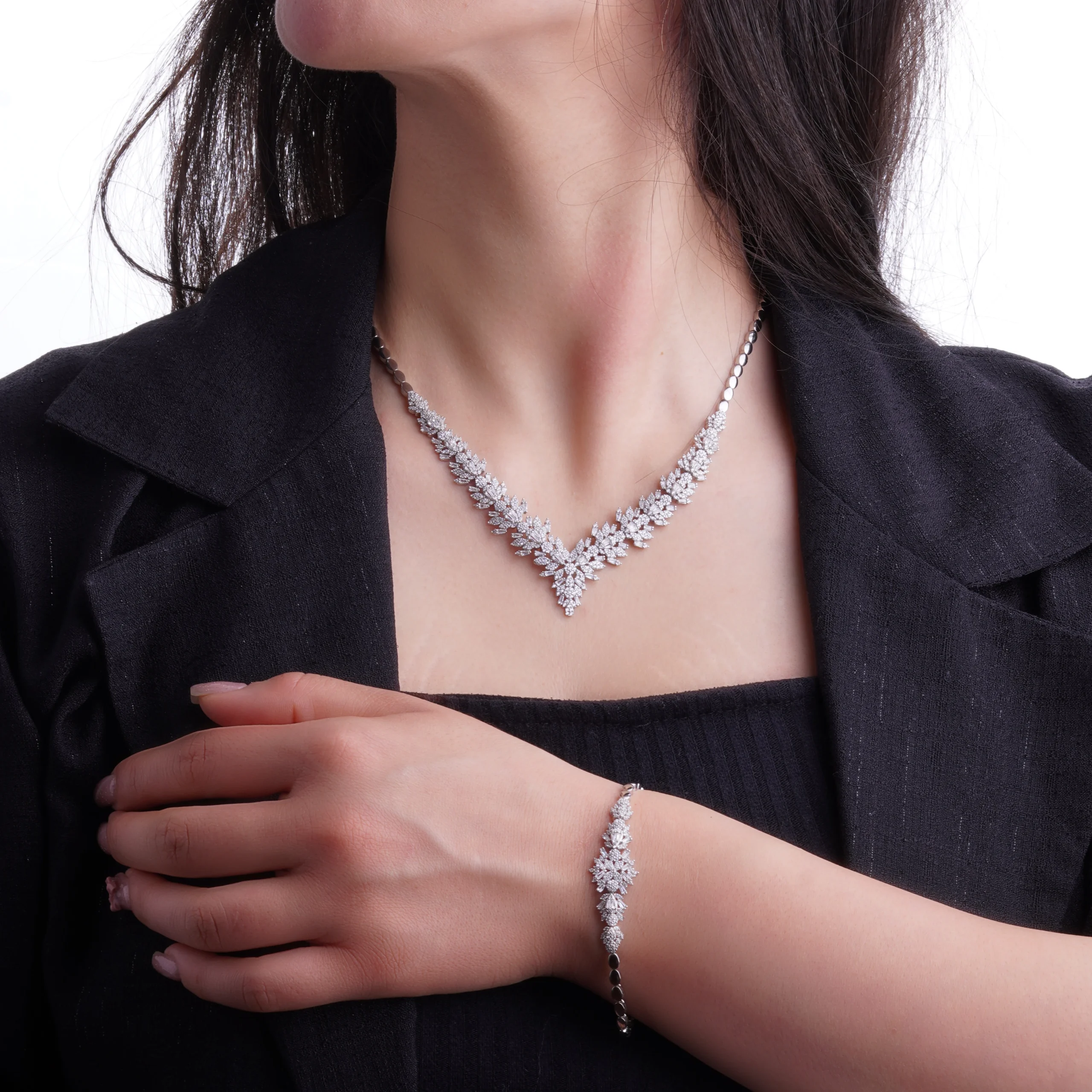 این سرویس ظریف و پرجذبه با الهام از آرایش برگهای تراشخورده طراحی شده است؛ ترکیبی هماهنگ از نگینهای مارکیز، باگت و گرد که کنار هم سطحی درخشان و چندبُعدی ایجاد کردهاند.