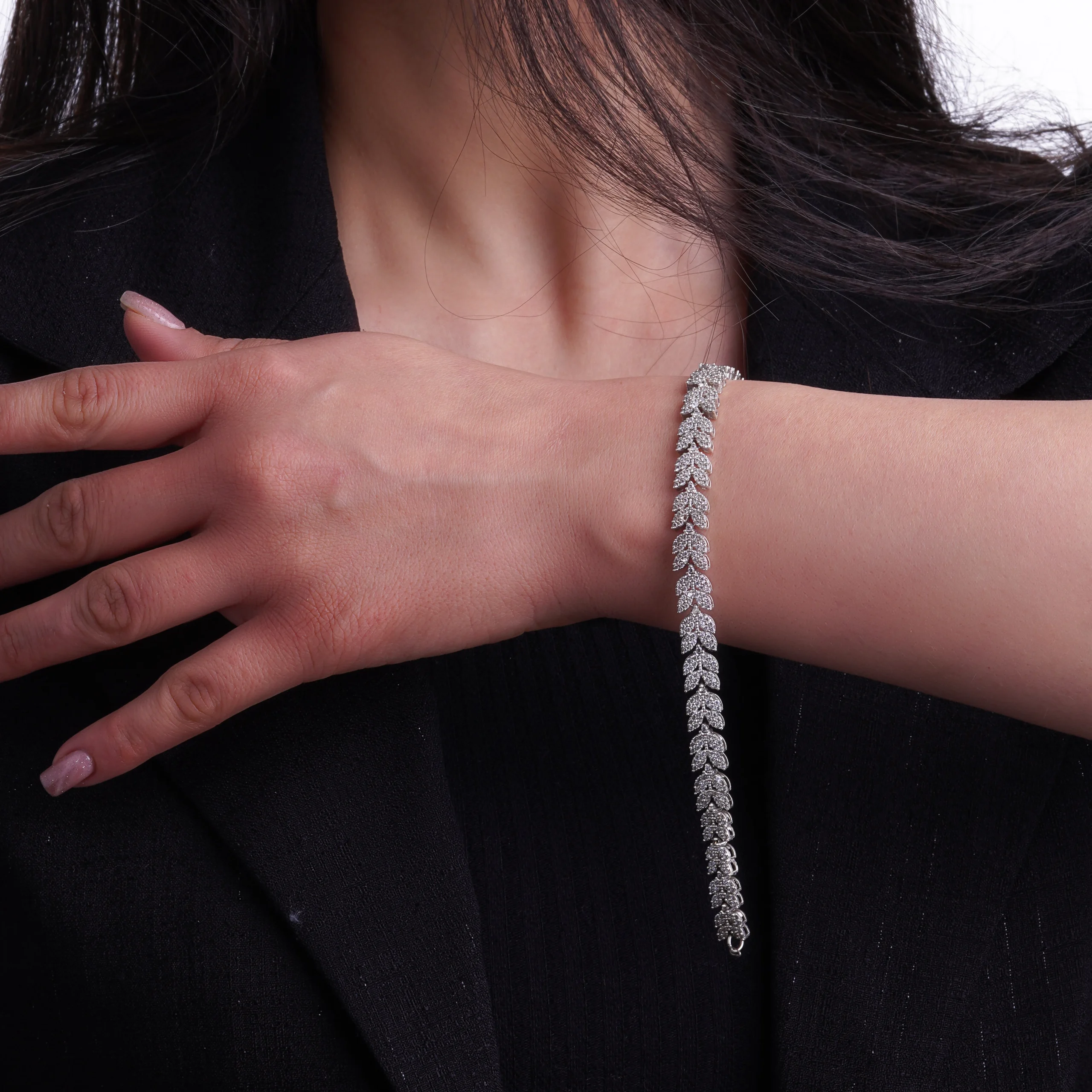 این دستبند نقره زنانه با الهام از فرم برگ و طبیعت طراحی شده؛ قطعاتی منظم و تکرارشونده که در کنار هم زنجیرهای لوکس و پرجزئیات ساختهاند. نگینهای زیرکونیا بهصورت فشرده و یکدست روی هر برگ کار شدهاند و جلوهای درخشان، اما کنترلشده ایجاد کردهاند.