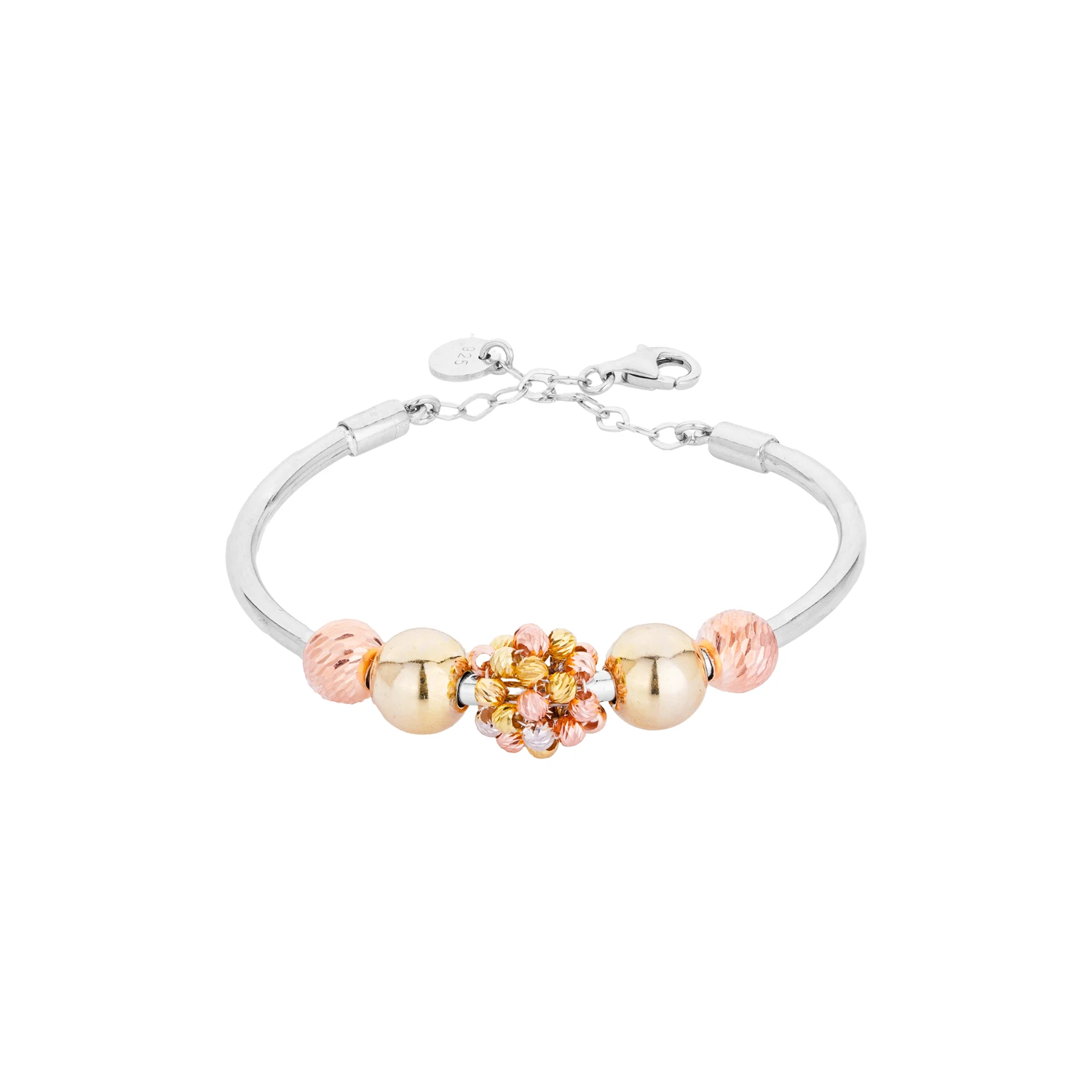 این دستبند نقره با طراحی شیک و مدرن، ترکیب زیبایی از گویهای فلزی طلایی و رزگلد و کریستالهای رنگی را ارائه میدهد که در طراحی آن از دقت و ظرافت بالایی استفاده شده است. گویهای فلزی براق در کنار کریستالهای رنگی که به شکل گل در مرکز دستبند قرار گرفتهاند، زیبایی خاصی به این دستبند بخشیدهاند. این دستبند بهراحتی میتواند در استایلهای روزمره و کژوال به عنوان یک اکسسوری خاص و شیک استفاده شود. طراحی ظریف و رنگهای ملایم آن این امکان را میدهد که برای مناسبتهای مختلف و استایلهای متفاوت مناسب باشد.