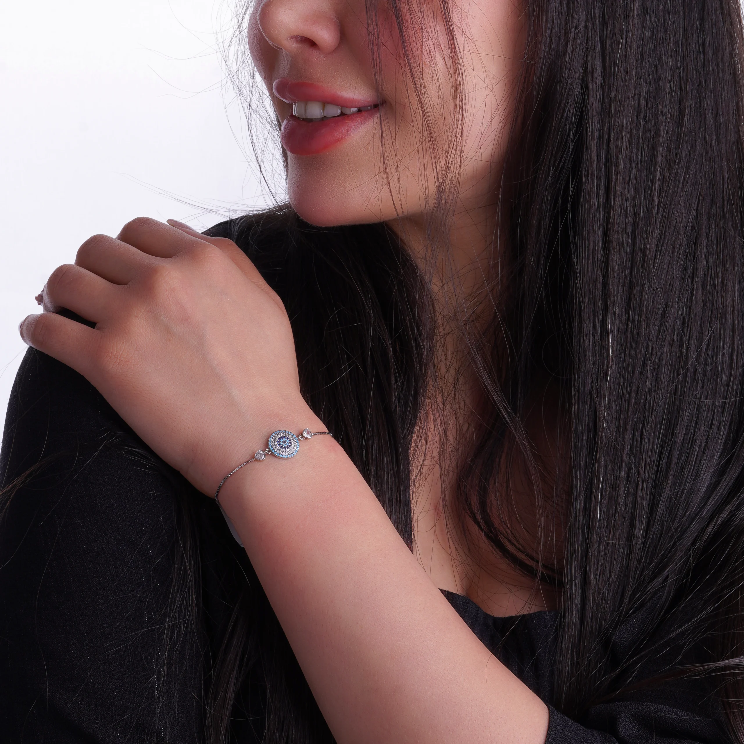 این دستبند از نقره 925 با سنگهای زیرکونیا و رنگهای آبی و سفید طراحی شده است.