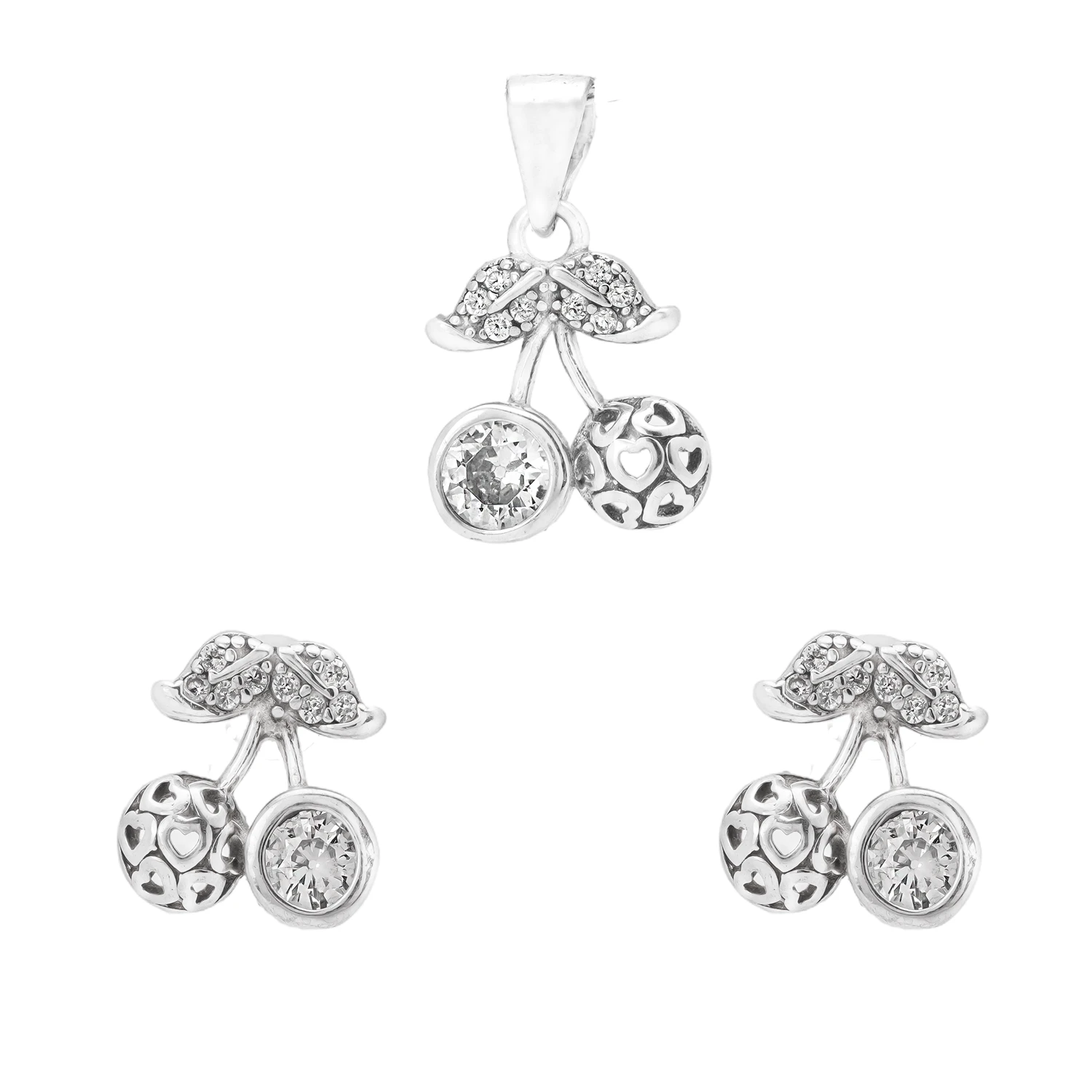 نیمست نقره زنانه طرح گیلاس با نگینهای اتمی درخشان، شامل یک پلاک و یک جفت گوشواره. طراحی فانتزی، نماد عشق و طراوت. ساختهشده از نقره استرلینگ ۹۲۵ از شميم سيلور.