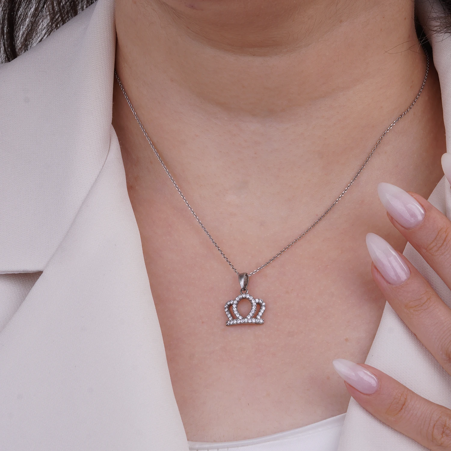 طراحی متقارن و خطوط نرم تاج، حس وقار و لطافت را همزمان منتقل میکند و آن را به انتخابی ایدهآل برای افرادی تبدیل کرده که به زیورآلات معنادار و خاص علاقهمند هستند. درخشش یکنواخت نگینها روی نقره براق، این پلاک را مناسب استفاده روزمره تا موقعیتهای رسمی میسازد.