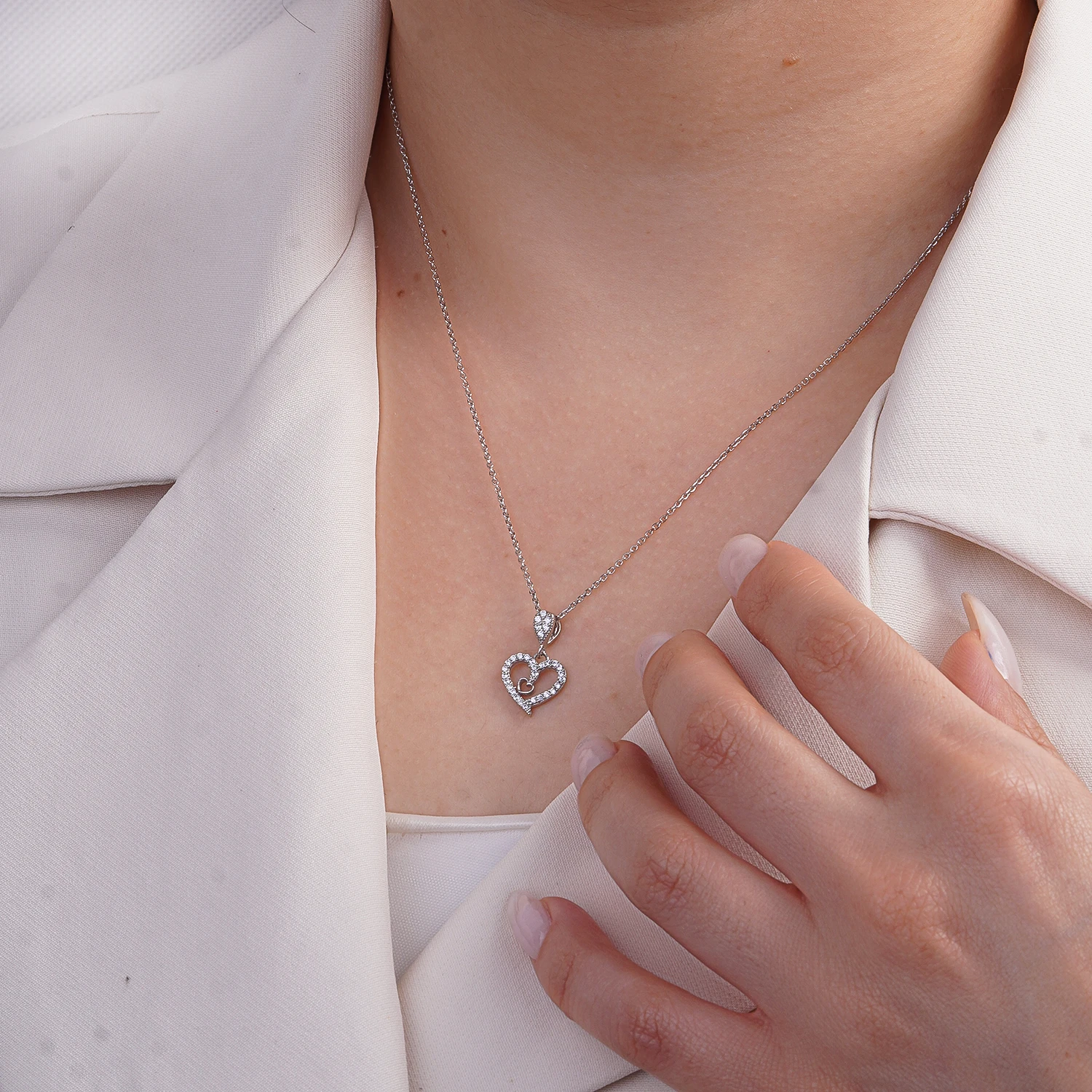 نیمست نقره زنانه: طراحی قلب دوبل با نگینهای میکروست درخشان
