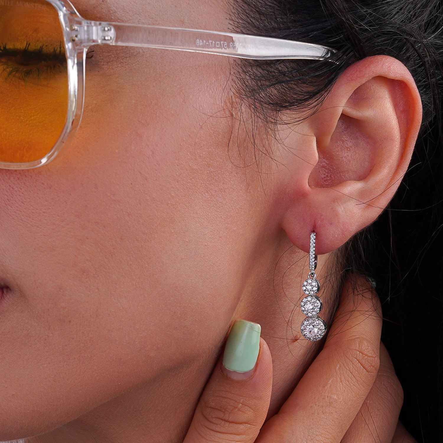 این گوشواره نقره آویز با ترکیب سه دایرهی نگینکاریشده، جلوهای کلاسیک و درخشان دارد که بهزیبایی حرکت نور را بازتاب میدهد. طراحی پلکانی و متوازن آن، حس ظرافت و وقار را القا میکند و نگینهای زیرکونیای سفید با چیدمان دقیق، درخششی شبیه الماس ایجاد کردهاند.
