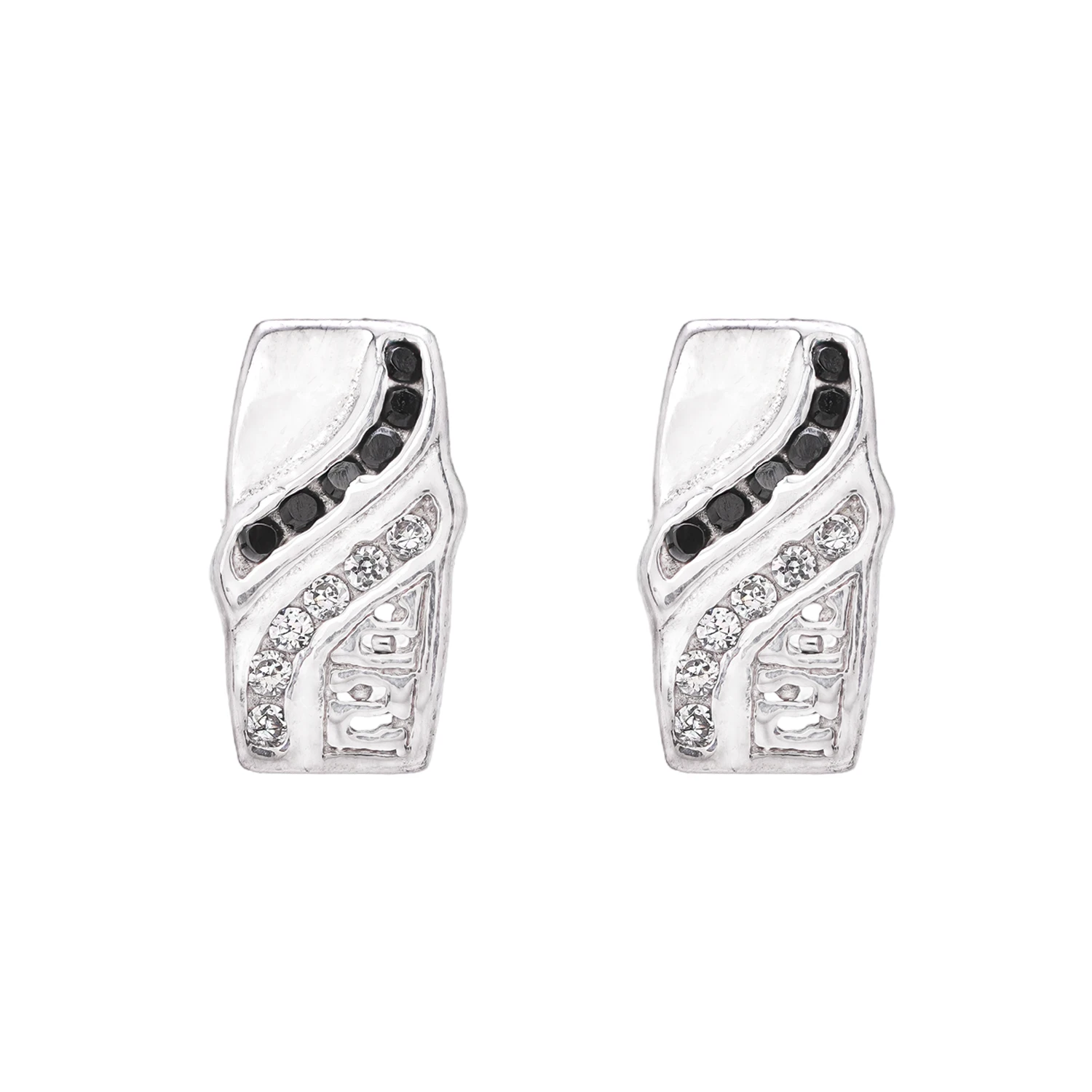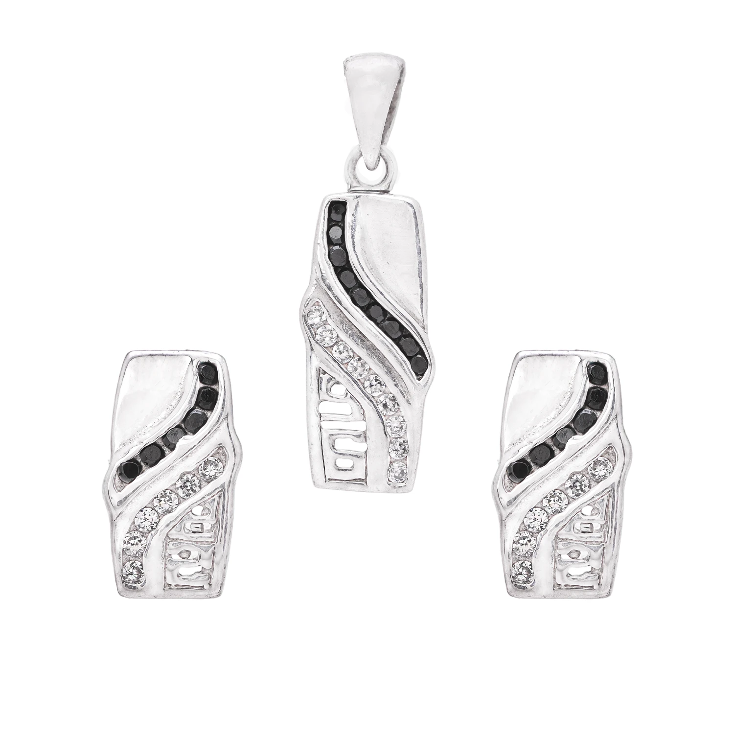 نیمست نقره ۹۲۵ دو رنگ با نگینهای مشکی و سفید و طراحی مدرن؛ شامل گوشواره و پلاک. مناسب استایل روزمره و رسمی. خرید نیمست کد 10150037 از شمیم سیلور.
