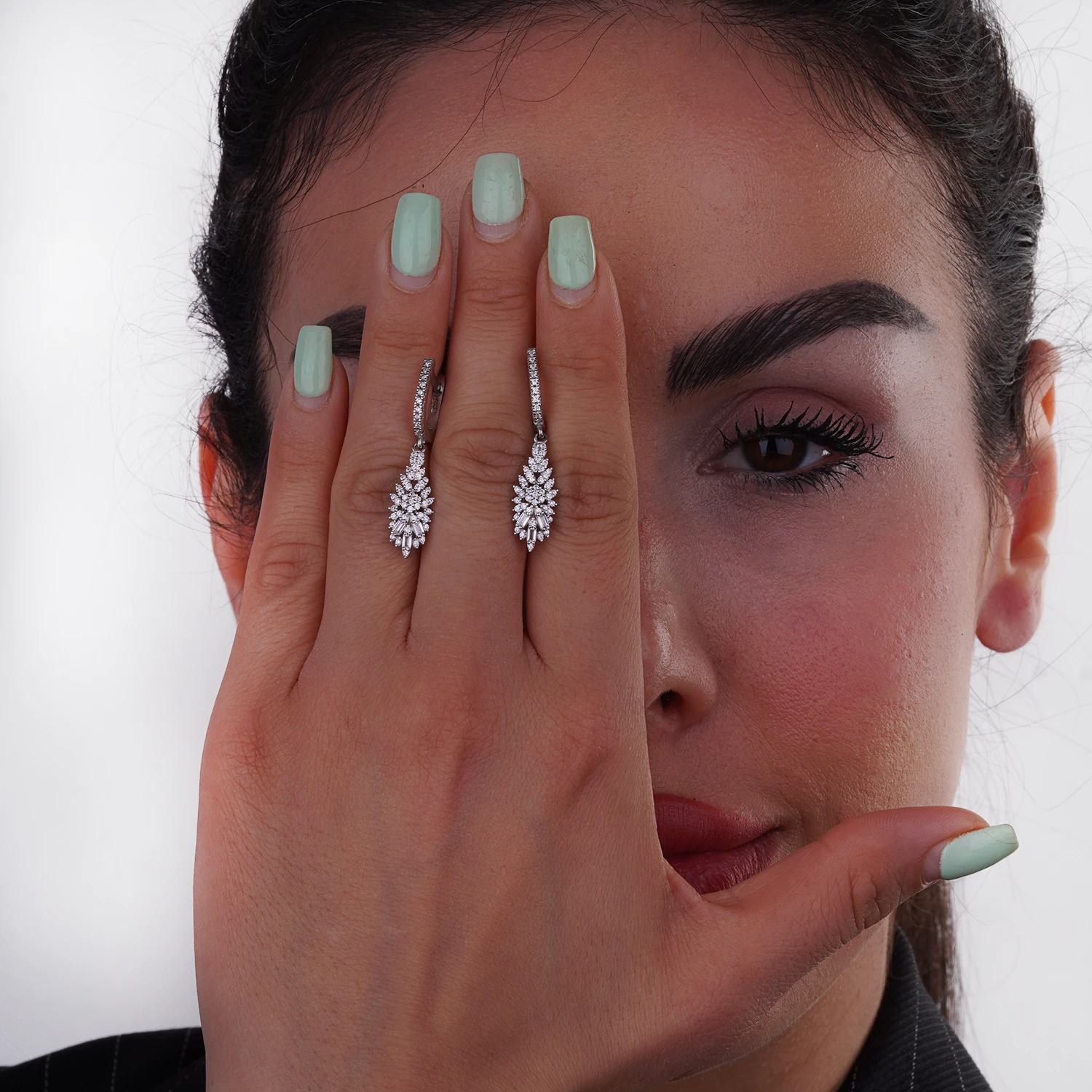این گوشواره نقره ظریف و لوکس با طراحی برگنشان چندلایه، جلوهای چشمگیر و اشرافی ایجاد میکند. چیدمان دقیق نگینهای زیرکونیا در تراشهای مختلف—از باگتهای کشیده تا برلیانهای ریز—باعث شده این کار همچون خوشهای از نور بدرخشد و با هر حرکت، درخشش چشمگیری داشته باشد. قفل لولایی محکم و راحت، استفادهی روزانه و مجلسی را بسیار دلپذیر میکند.
