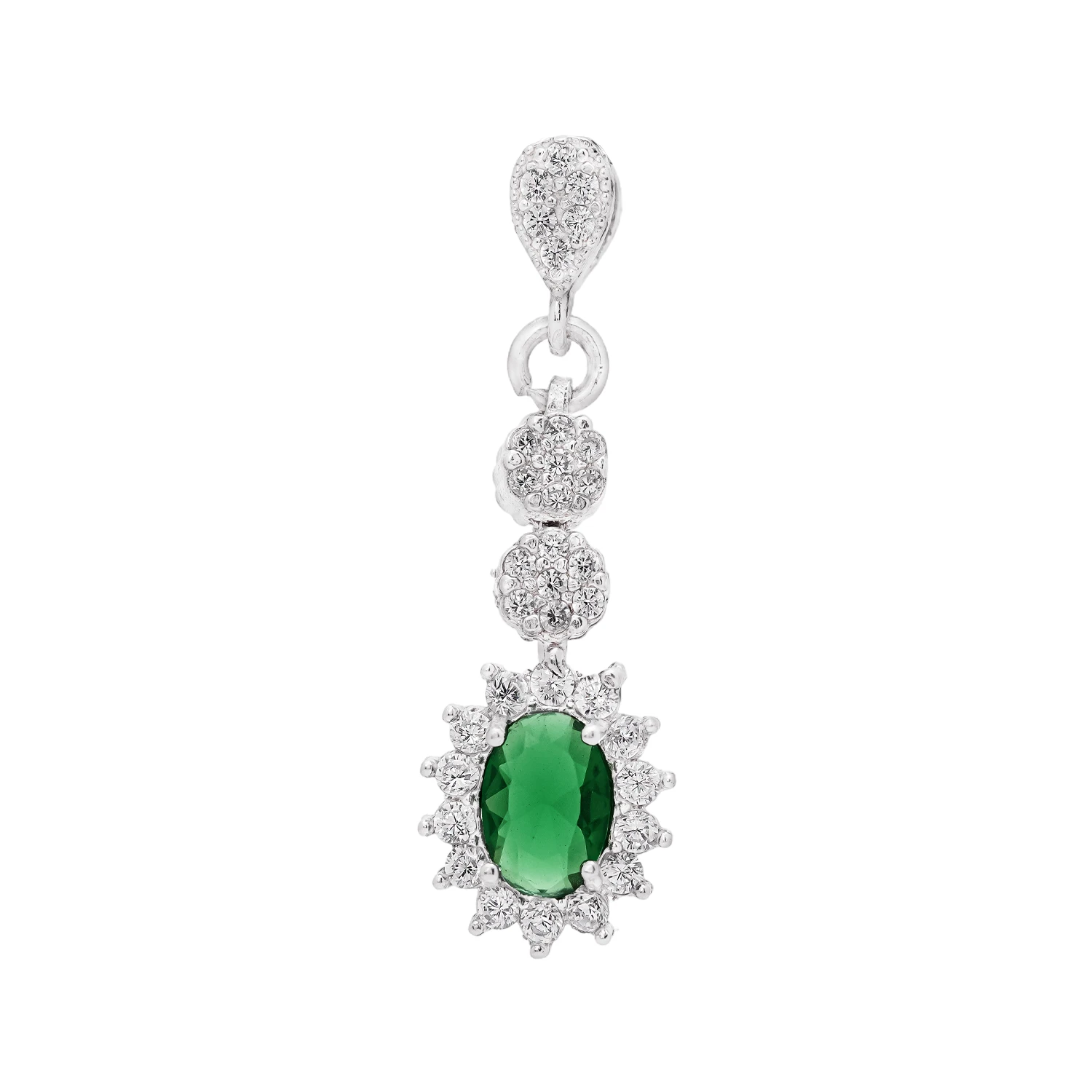 پلاک آویزی نقره ۹۲۵ با سنگ سبز بیضی و نگینهای اتمی سفید. طراحی لوکس و رسمی مناسب مهمانیها و استایل مجلسی. خرید آنلاین از شميمسيلور.