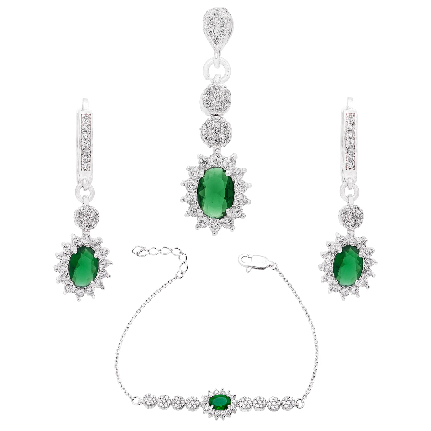 نیمست نقره ۹۲۵ با سنگ سبز طرح زمرد و نگینهای میکروست؛ شامل گوشواره، پلاک و دستبند. درخشان و مناسب هدیههای خاص. خرید نیمست کد 1015008 از شمیم سیلور.