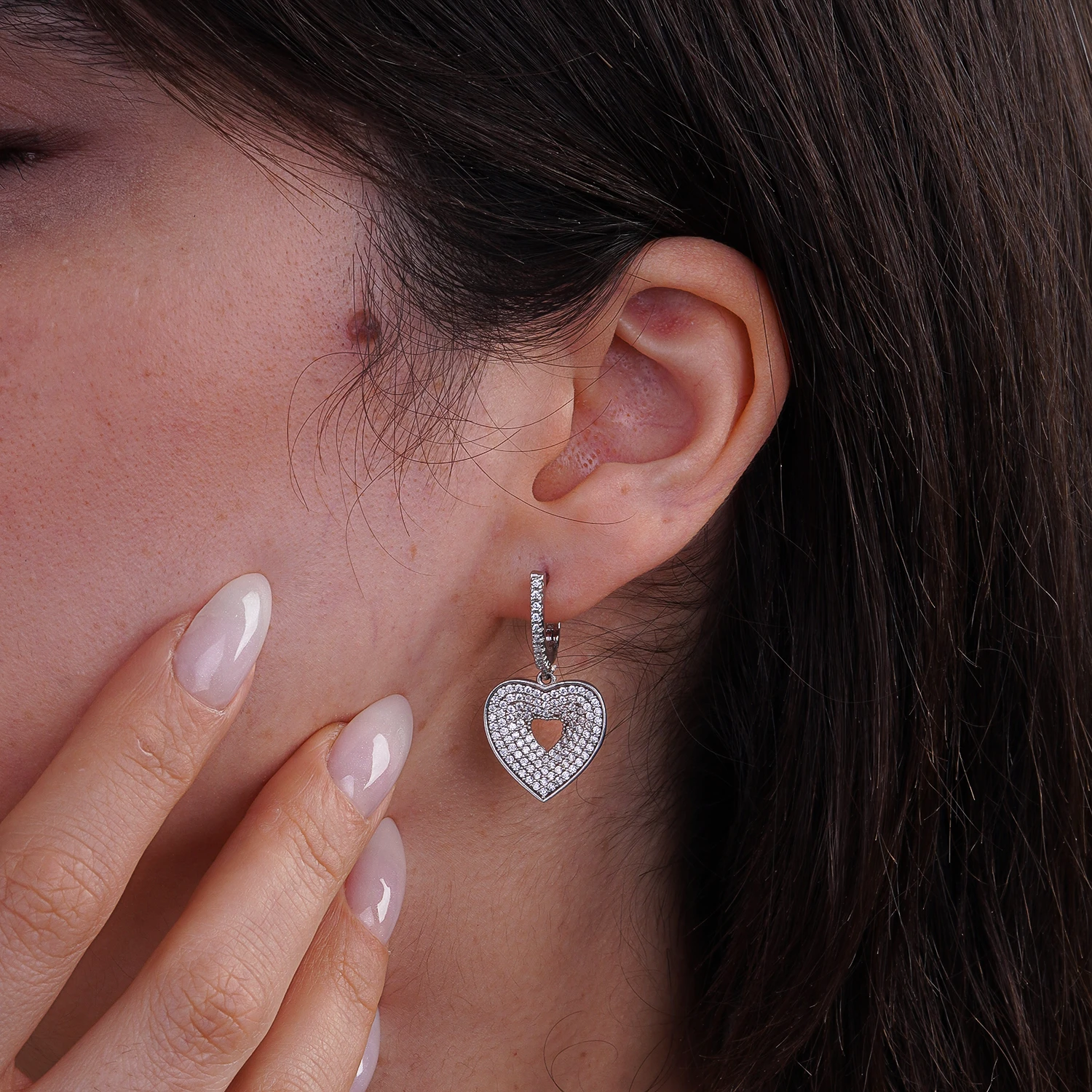این گوشوارهی آویز نقره با طرح دلنشین قلب، آمیزهای از درخشش و احساس را در قالبی ظریف و خیرهکننده ارائه میدهد. قلب مرکزی با نگینهای میکروستِ زیرکونیای شفاف پوشیده شده و جلوهای نورگیر و چشمنواز ایجاد کرده است. فرم توخالی قلب در مرکز، طراحی را سبکتر و ظریفتر جلوه میدهد و حس لطافت و عاشقانه بودن را تقویت میکند.