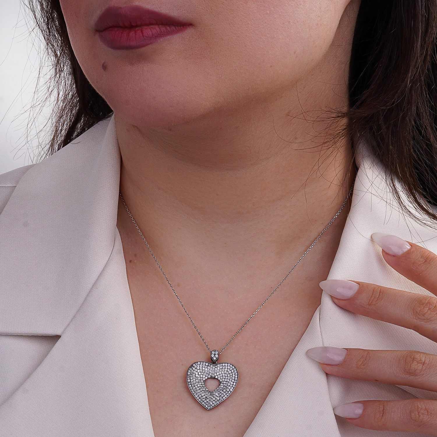 این پلاک نقره با طرح عاشقانهی قلب، تصویری از درخشش و لطافت احساس را در قالب زیوری ظریف و باشکوه ارائه میدهد. تمام سطح قلب با نگینهای ریز و درخشان زیرکونیای شفاف پوشیده شده و برق خیرهکنندهای ایجاد کرده است؛ گویی بارانی از نور روی قلبی کوچک نشسته است.
