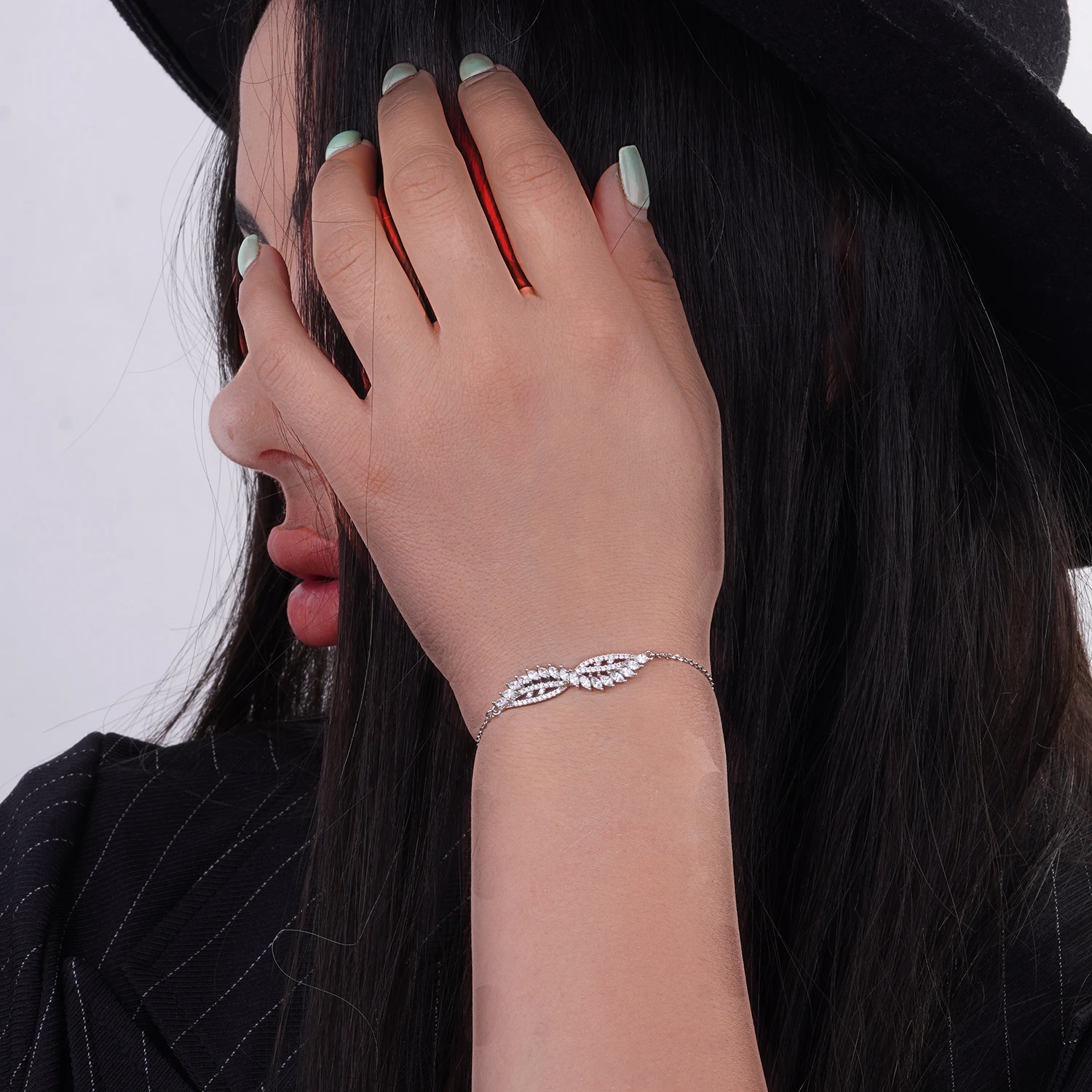 این دستبند ظریف و درخشان با طراحی الهامگرفته از فرم پر و برگهای ظریف، جلوهای بسیار لطیف و زنانه ایجاد کرده است. ترکیب نگینهای مارکیز و زیرکونیاهای ریز که بهصورت میکروست در کنار یکدیگر نشستهاند، سطحی پرنور و یکپارچه ساخته که از هر زاویه درخشش چشمگیری دارد.