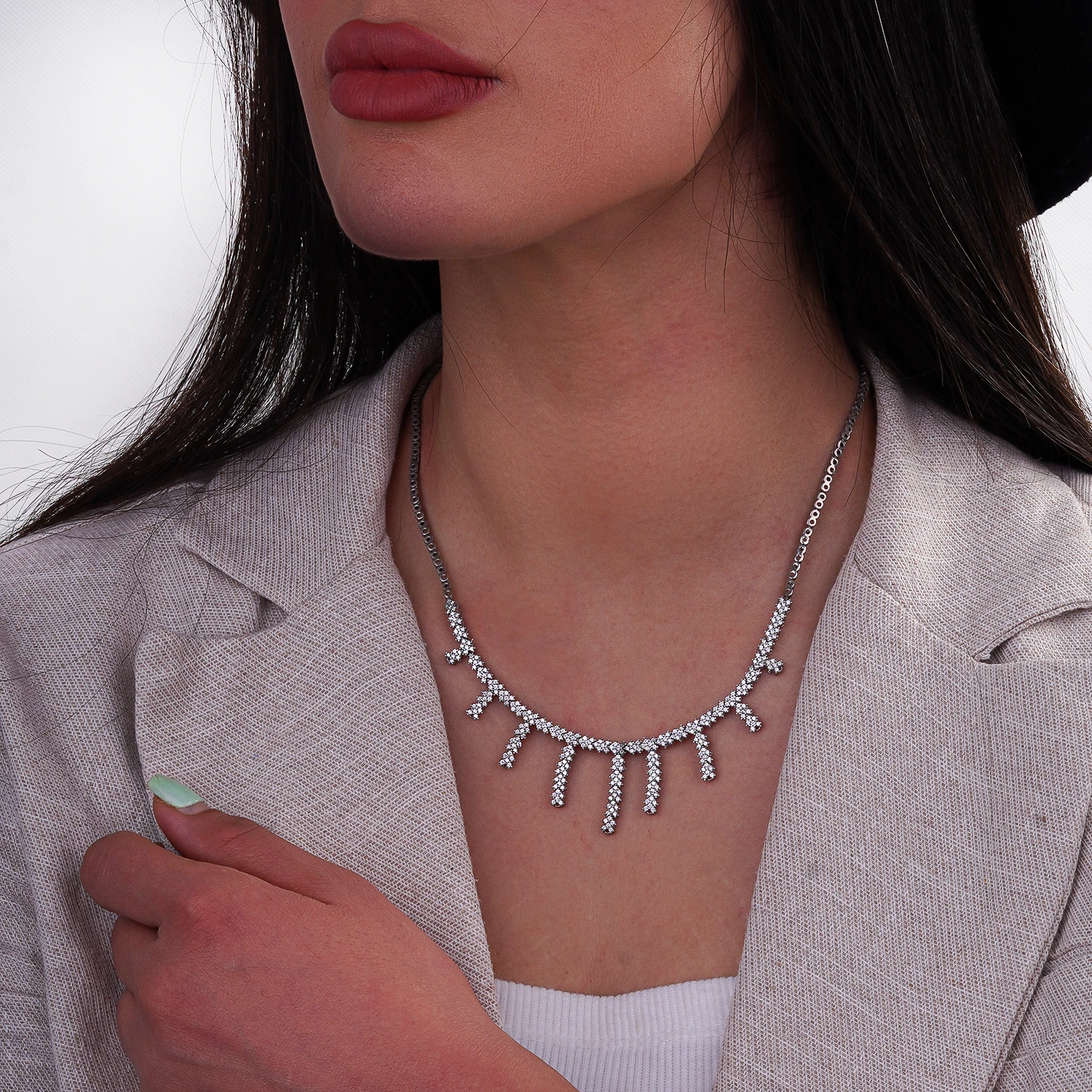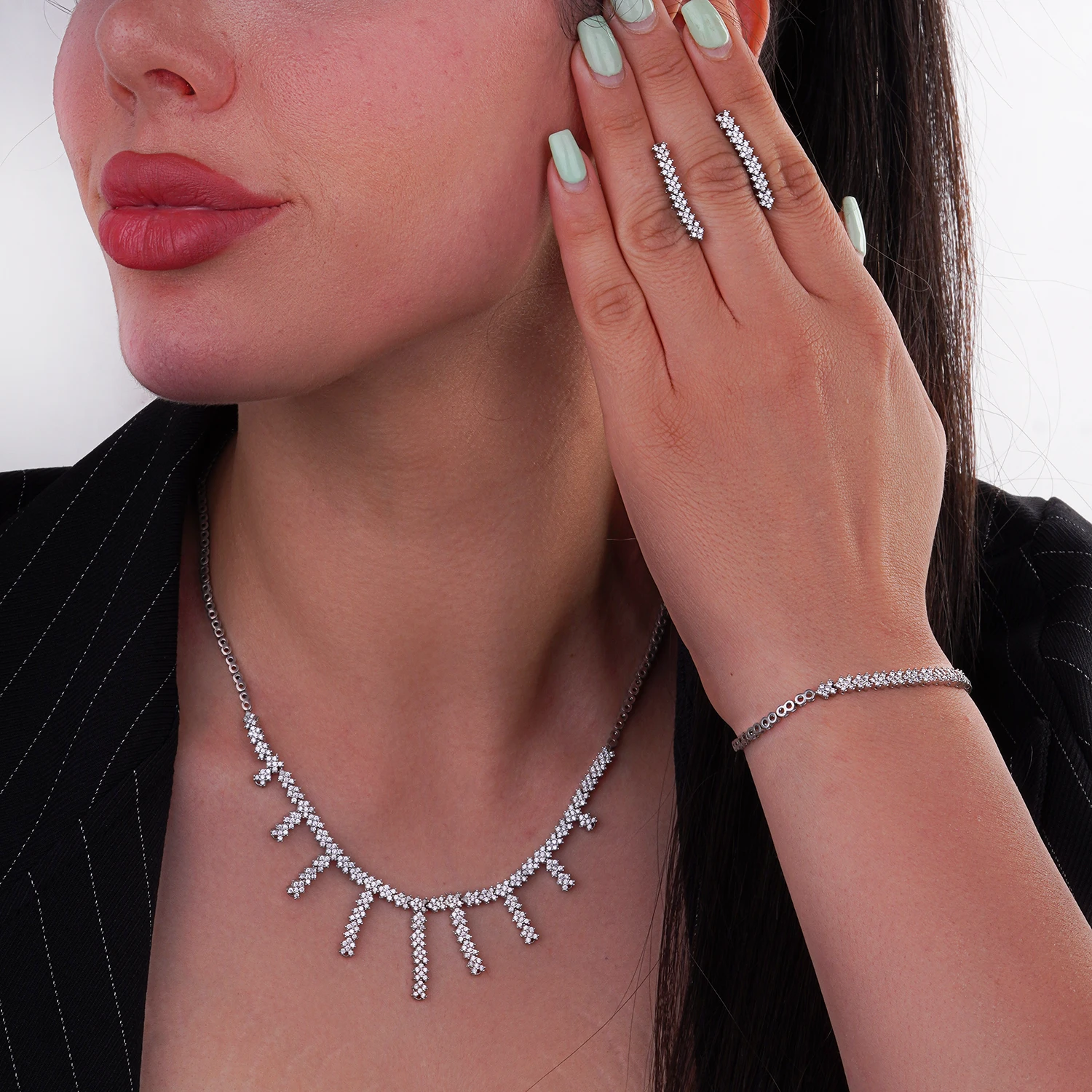 این ست نقره ۹۲۵ با طراحی الماسی و آویزهای چندلایه، جلوهای فوقالعاده لوکس و مجلسی ایجاد میکند. ساختار گردنی از ردیفهایی منظم از نگینهای تشکیل شده که با آویزهای عمودی و پلهای، تلألو و حجم بیشتری به استایل میبخشد. هر آویز همانند قطرهای از نور روی خط گردن مینشیند و در هر حرکت، انعکاسی خیرهکننده ایجاد میکند.