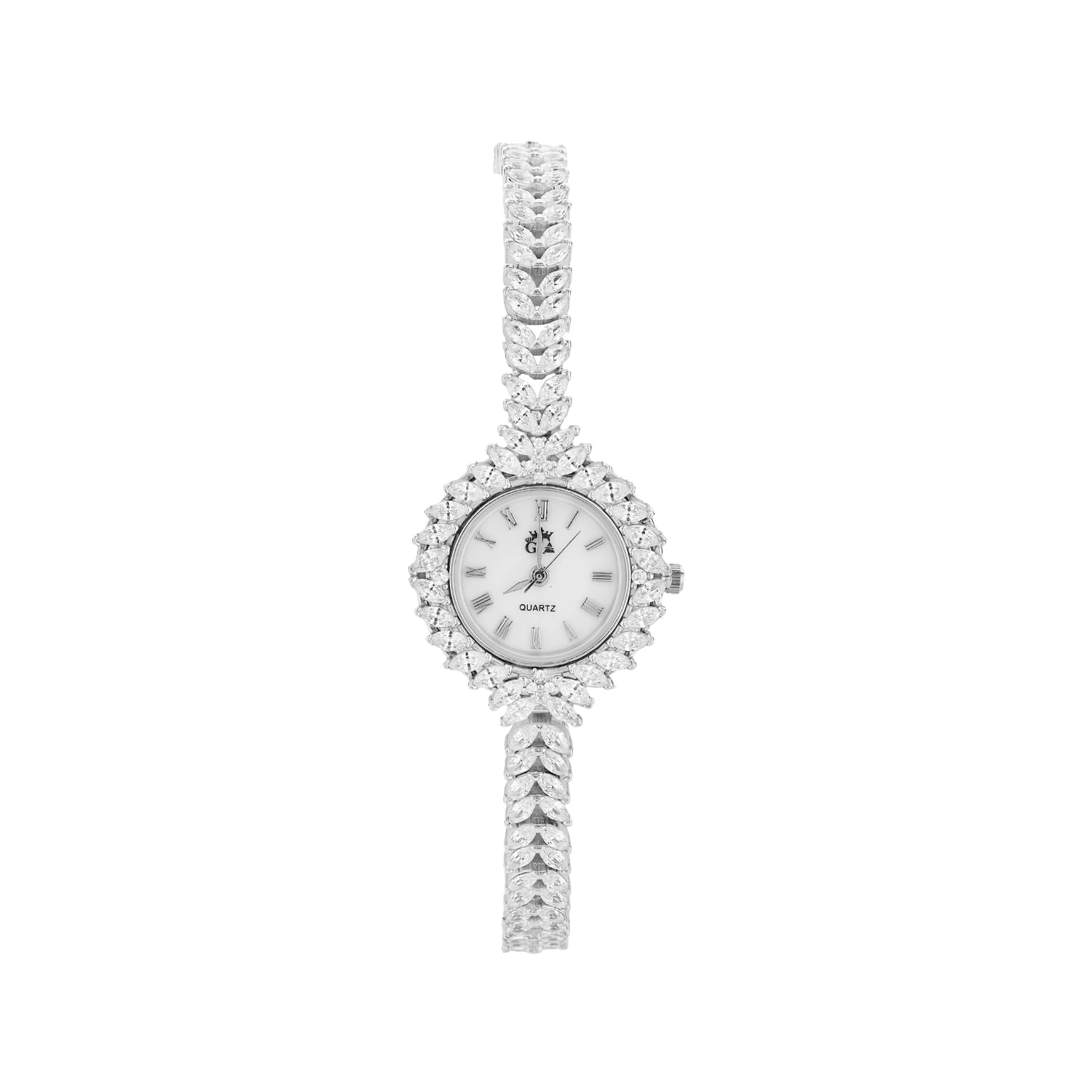 ساعت نقرهای با طراحی لوکس و نگینهای میکروست برلیان، انتخابی ایدهآل برای مراسم رسمی و هدیههای خاص.