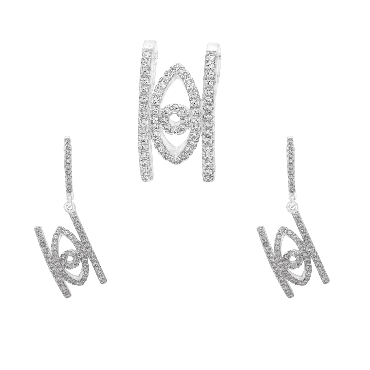 نیمست نقره ۹۲۵ طرح مدرن با نگینهای زیرکونیا و گوشوارههای آویز درخشان؛ مناسب مهمانیها و هدیههای خاص. خرید نیمست زنانه کد 10150050 از شمیم سیلور.