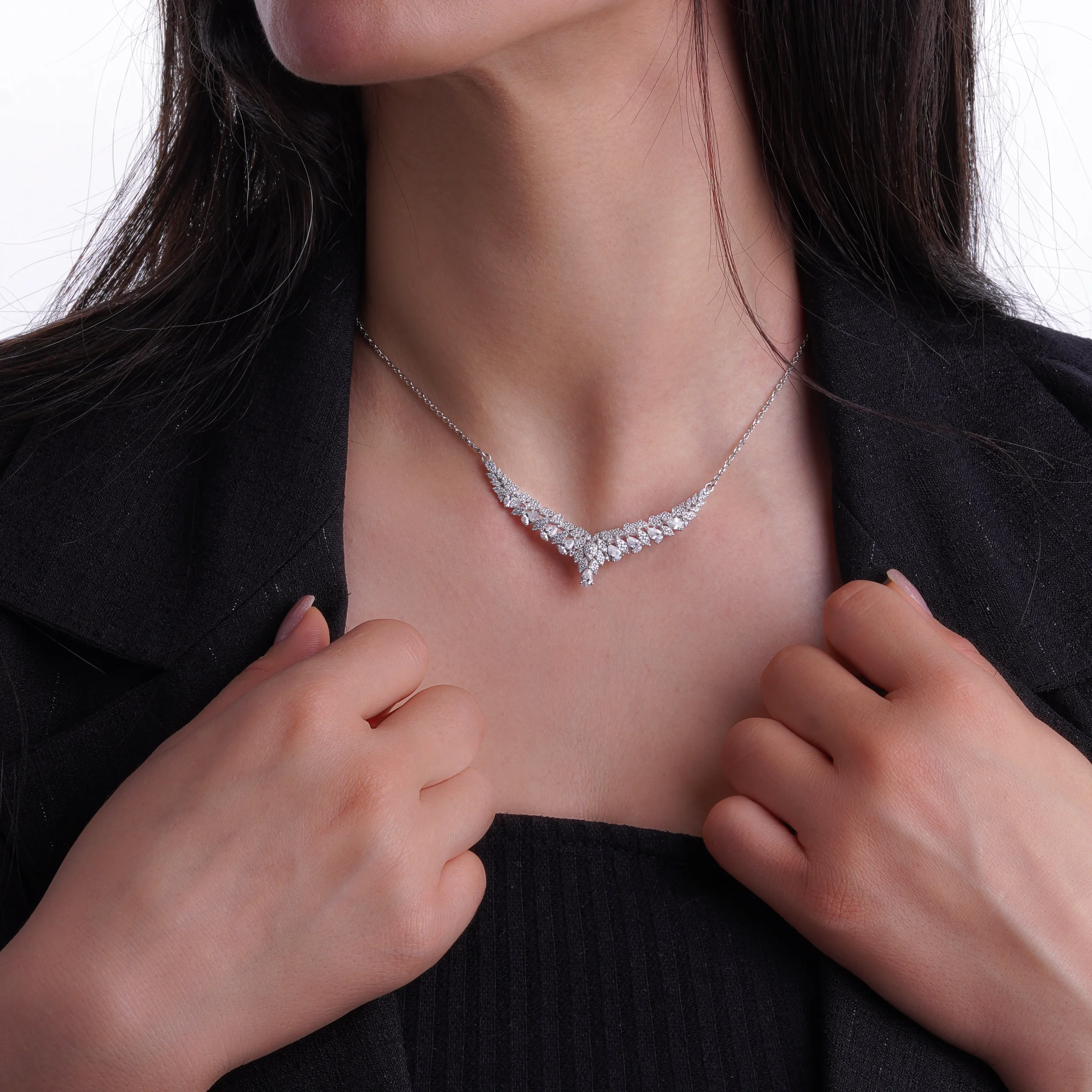 فرم V شکل گردنبند، روی خط گردن مینشیند و به دلیل طراحی پرجزئیات و خیرهکنندهاش، یک گزینه فوقالعاده برای بانوانی است که به استایل مجلسی با جزئیات ظریف و جلوهی الماسی علاقه دارند.