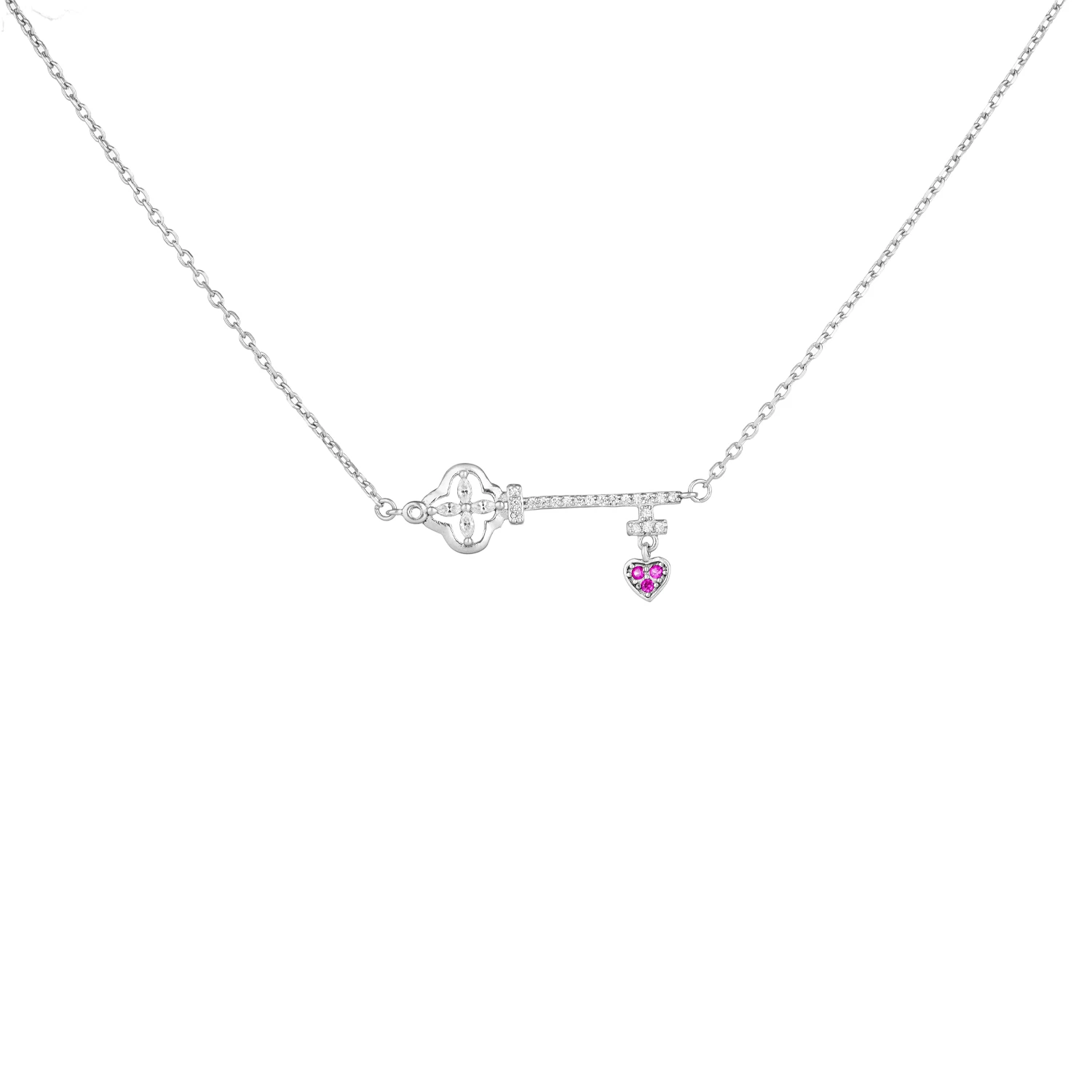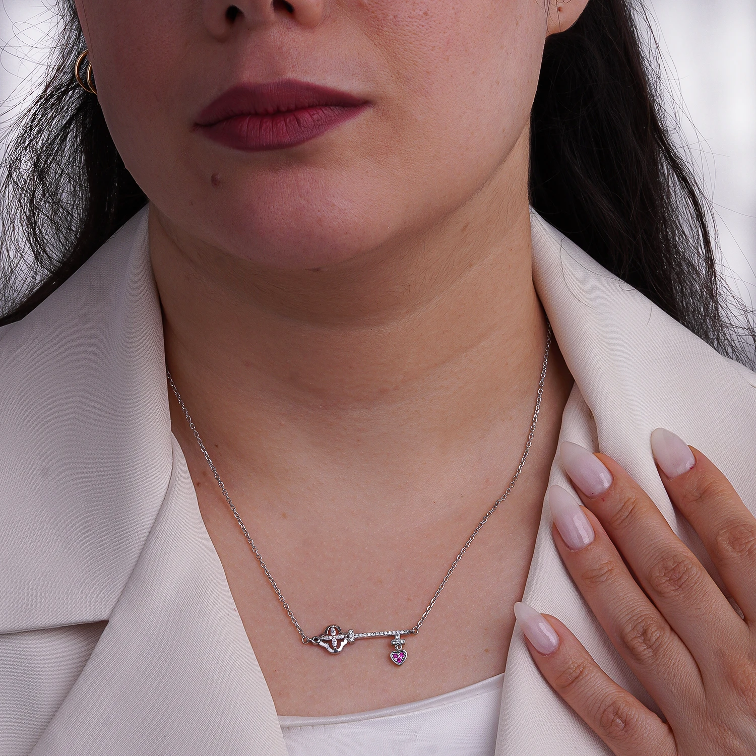 گردنبند نقرهای با طراحی منحصر به فرد و سنگهای زیرکونیا صورتی برای مجالس رسمی و استایلهای روزمره.