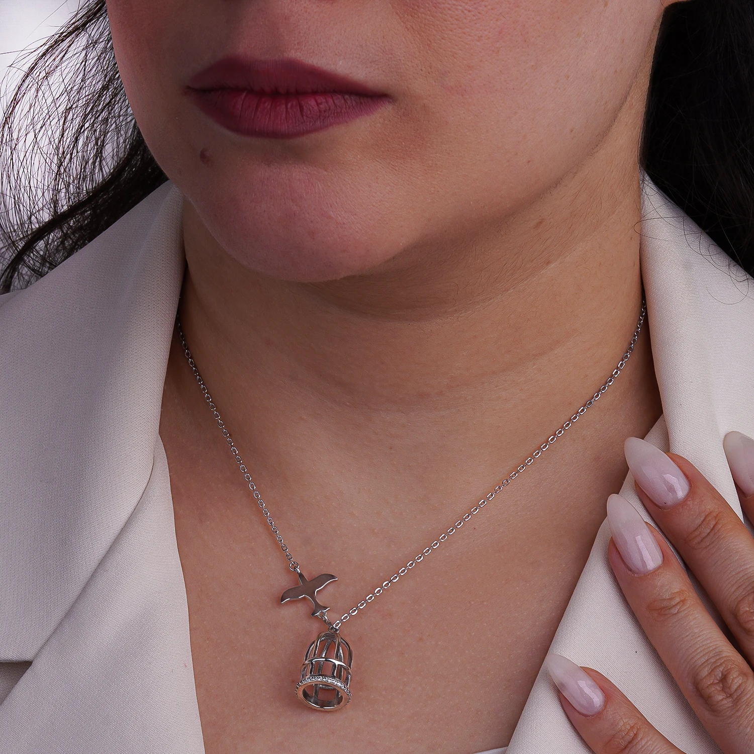 گردنبند نقرهای با طراحی قفس و پرنده10703