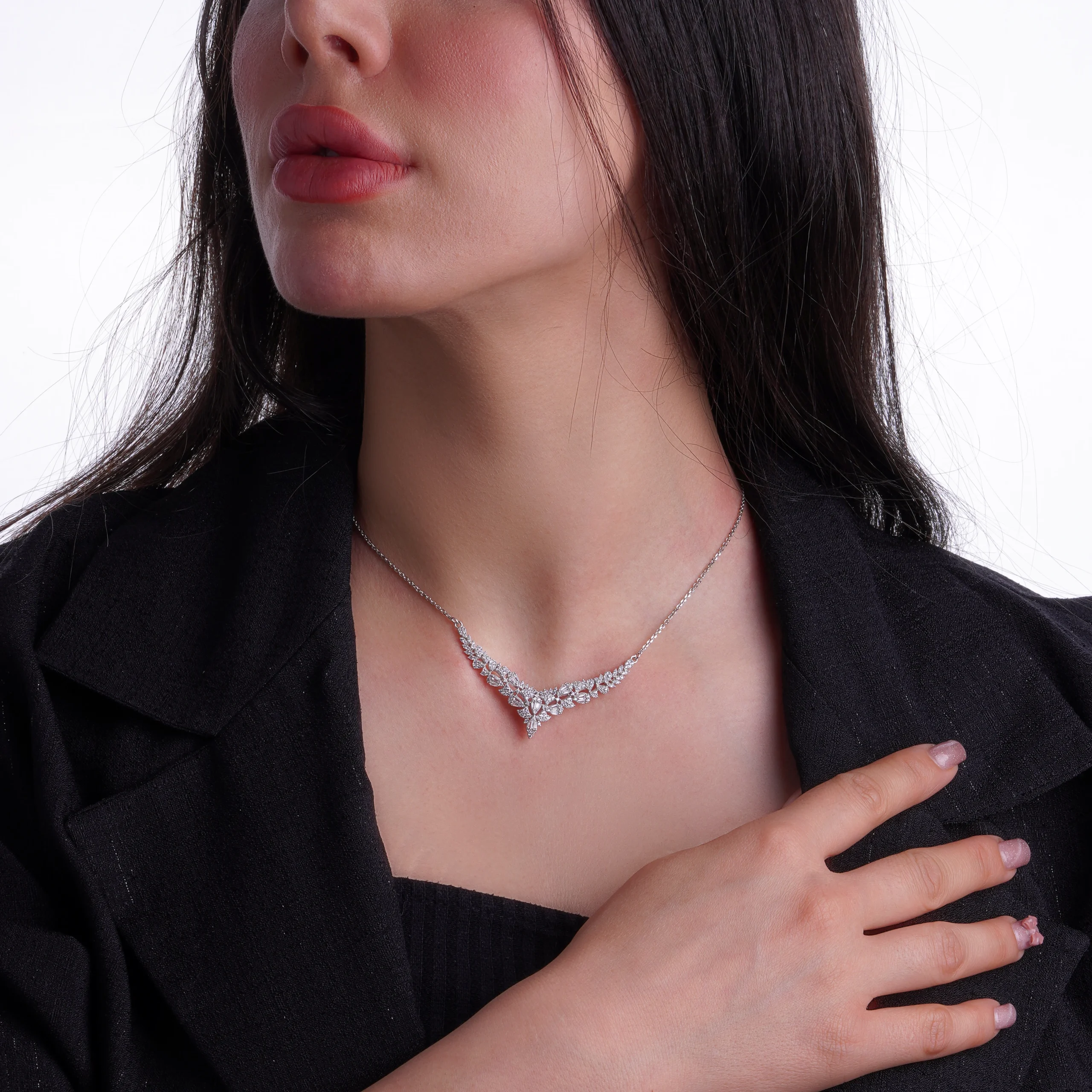 این گردنبند زیبا با طراحی گل-برگی فاخر و درخشان، ظاهر یک تکه جواهر خاص و سلطنتی را تداعی میکند. بخش مرکزی کار با ترکیب چشمنواز نگینهای باگت عمودی و نگینهای ریز میکروست تزئین شده است؛ ترکیبی که جلوهای الماسی، پرنور و کاملاً مجلسی ایجاد میکند.
