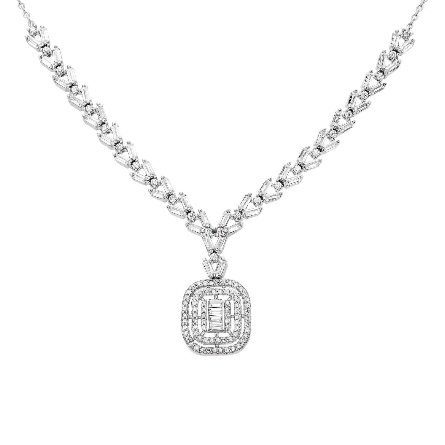 گردنبند نقره عیار ۹۲۵ شمیم سیلور با نگینهای باگت و زیرکونیا؛ مناسب مراسم رسمی و هدیهای لوکس. خرید از مجموعه زیورآلات شمیم سیلور.