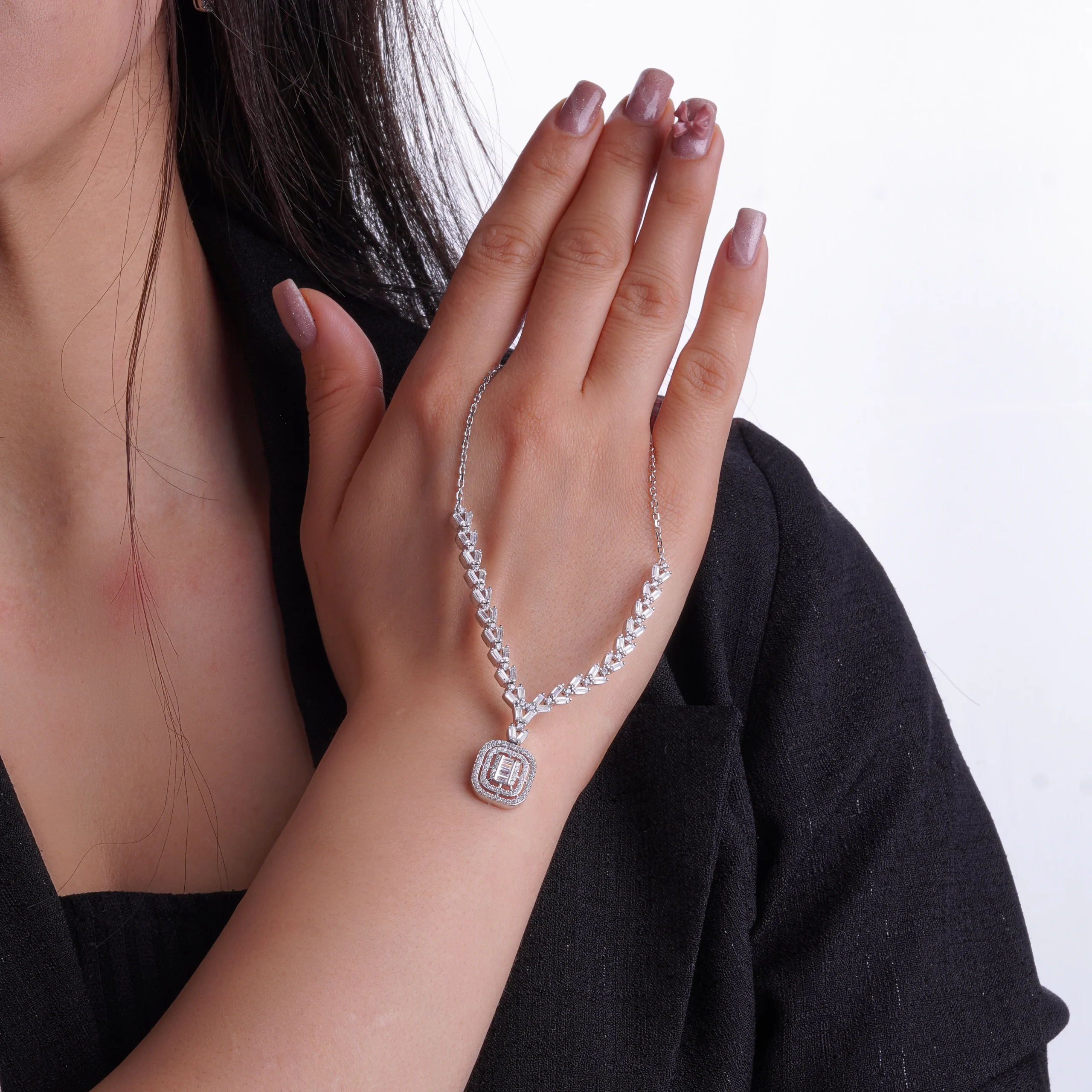 آویز مربعی چندطبقه با چیدمان باگت در مرکز و قاب درخشان اطراف آن، در مرکز گردنبند قرار گرفته و جلوهای شبیه جواهرات الماسکاری شده ایجاد میکند. زنجیر اصلی نیز با طراحی هندسی و نگینهای باگت صفرتا صد از نزدیک قابل توجه است و استایلی بسیار اشرافی و ظریف میسازد.