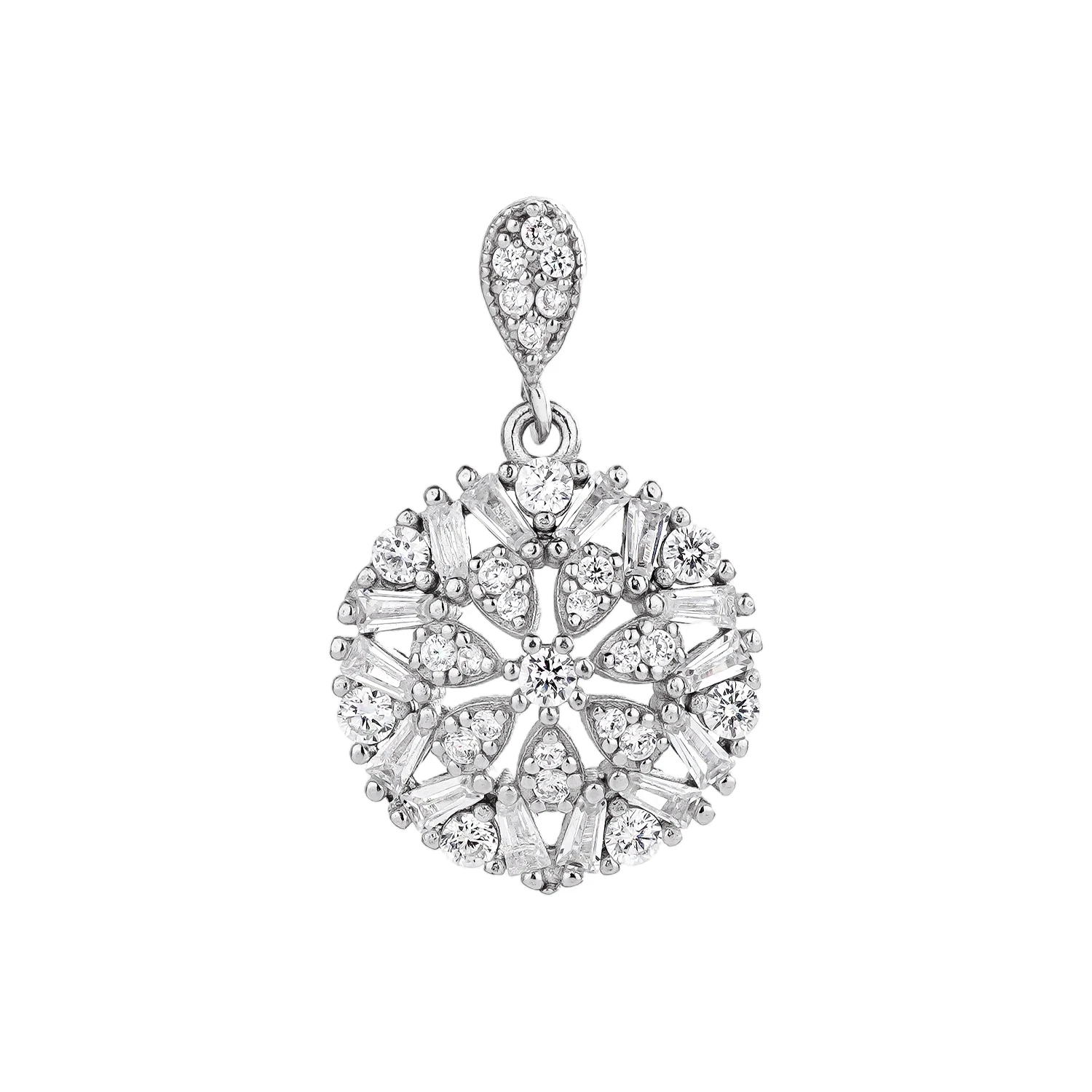 این مدل با فرم دایرهای/خورشیدی طراحی شده و ترکیبی از نگینهای زیرکونیا (Cubic Zirconia) را در دو تکنیک میکروست (Micro-Setting) و باگت (Baguette) بهکار میگیرد. میکروست، درخششی یکدست و ریزبافت ایجاد میکند و ردیفهای باگت، جلوهای خطی و لوکس میدهند؛ نتیجه، ظاهری حرفهای و مینیمال برای استایل روزانه تا مراسم رسمی است. یراق اشکیِ بالای پلاک نیز با ریزنگینها تزئین شده تا پیوستگی طرح حفظ شود.