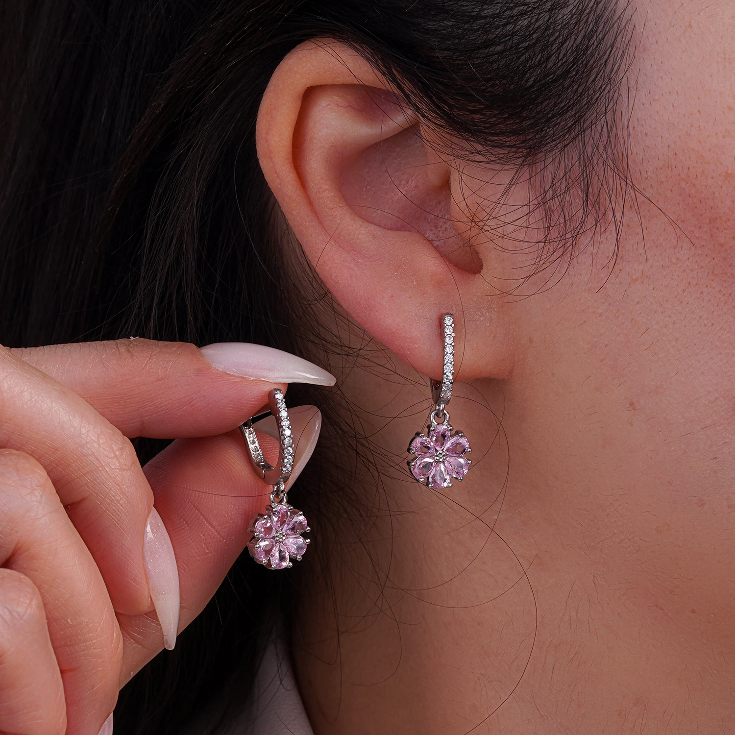 این گوشوارهی نقرهی ظریف با طراحی گل ششپر، ترکیبی از لطافت زنانه و درخششی چشمنواز را به نمایش میگذارد. نگینهای زیرکونیای صورتی با تراش اشکی در کنار نگینهای سفید ریز، جلوهای رومانتیک و دخترانه ایجاد کردهاند.