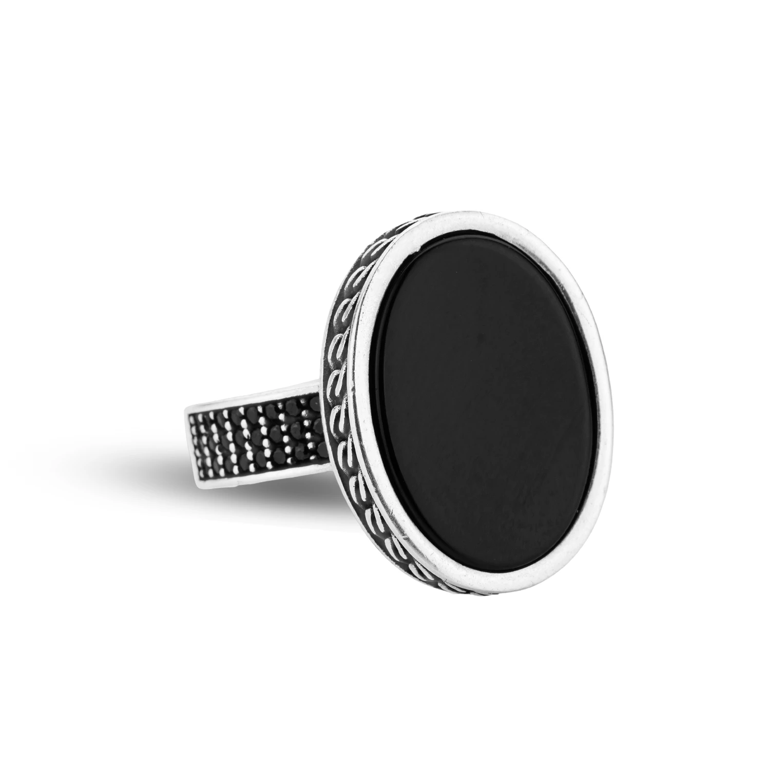 این انگشتر نقره مردانه با نگین اونیکس مشکی بیضیشکل، نمونهای شاخص از سبک کلاسیک-مینیمال است که وقار و قدرت را در عین سادگی به نمایش میگذارد. سطح صاف و یکدست نگین، جلوهای رسمی و عمیق ایجاد کرده و با رکاب نقرهای دارای جزئیات زنجیری و نگینکاری ظریف مشکی، ترکیبی متعادل و خوشساخت پدید آورده است.