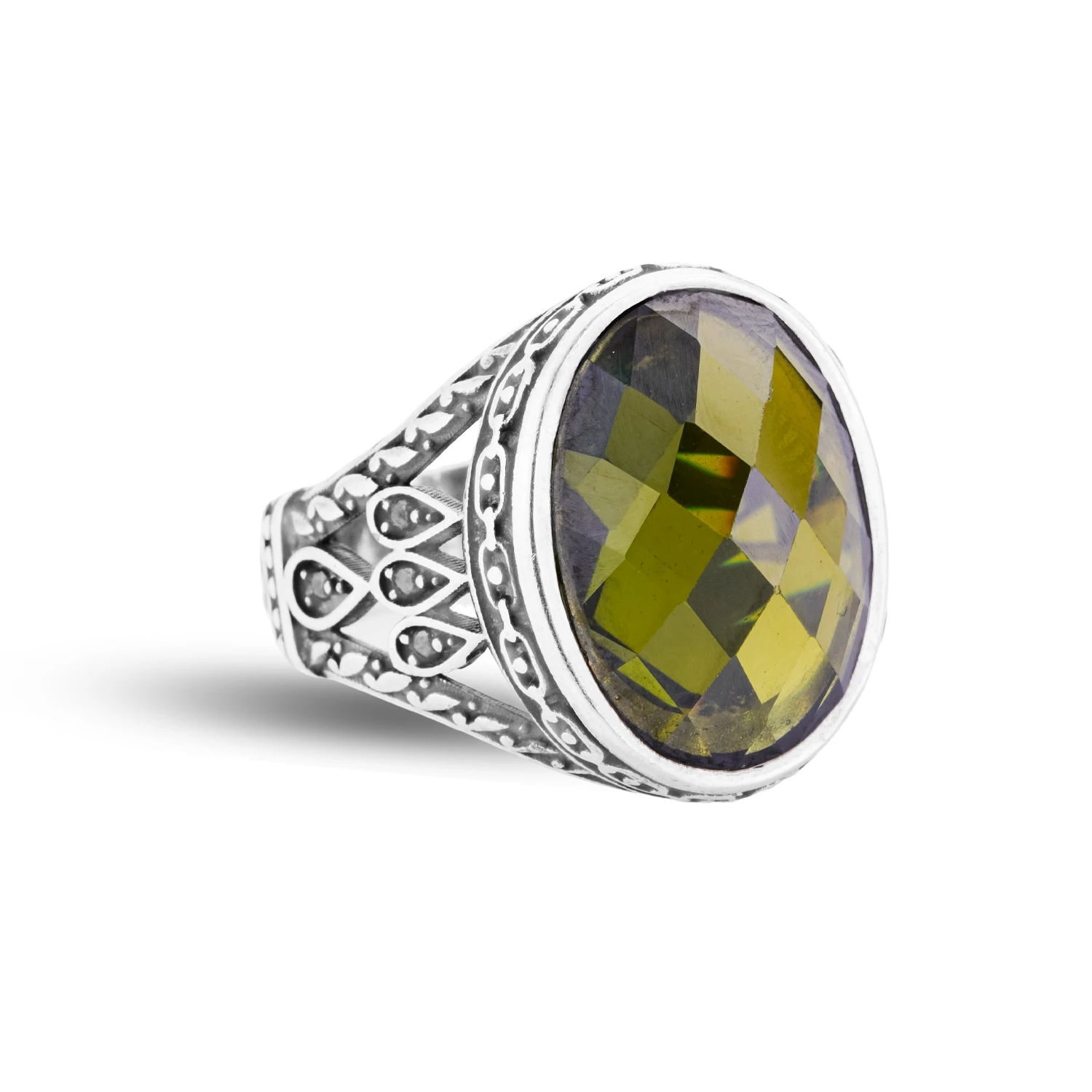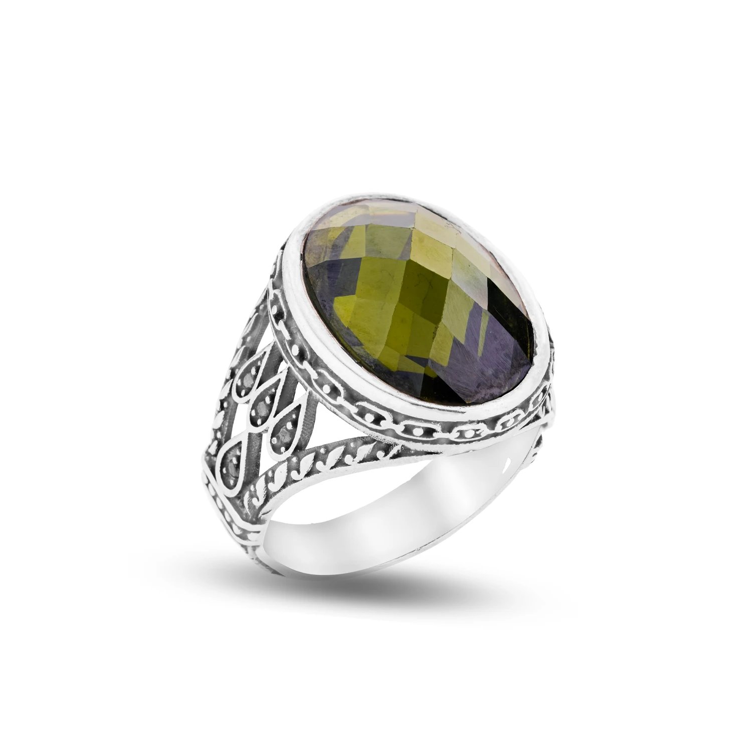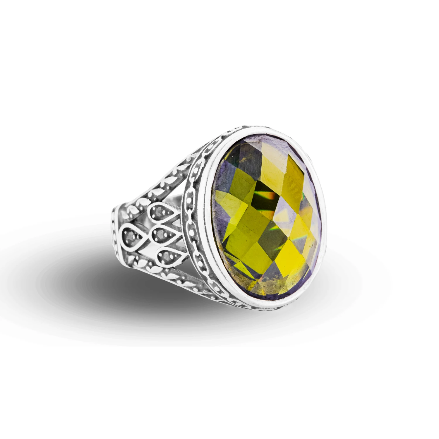 این انگشتر نقره با طراحی اصیل و چشمنواز، ترکیبی از سبک کلاسیک مردانه و جزئیات هنری است. نگین بیضی بزرگ با تراش فستدار، جلوهای چندبُعدی و درخشان ایجاد کرده که با تغییر زاویه نور، طیفی جذاب از رنگها را بازتاب میدهد.